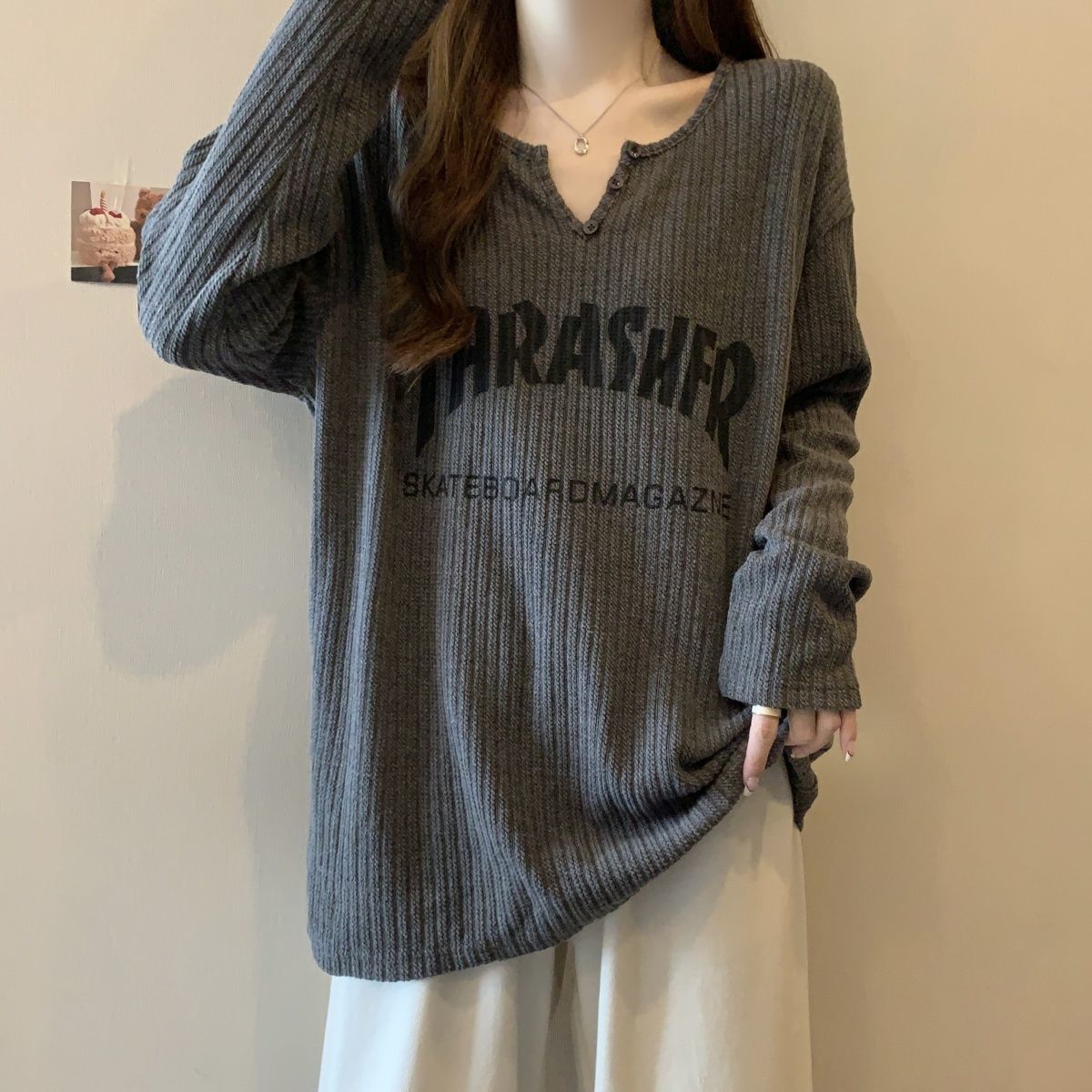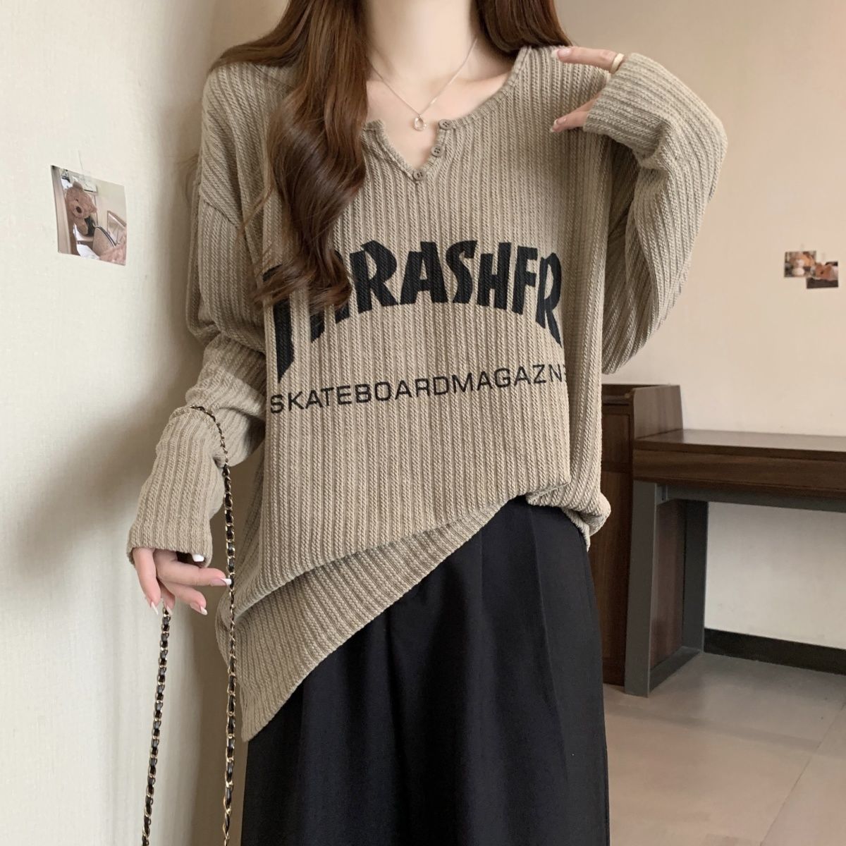 韓系卷边簡約慵懒风宽松顯瘦針織衫