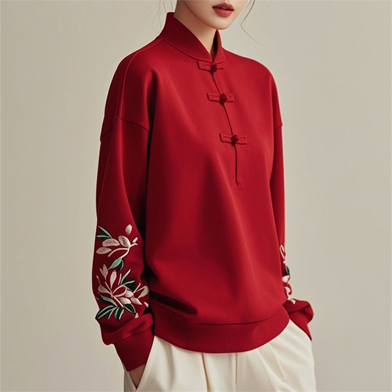 新中式國風盤扣刺繡立領德絨長袖