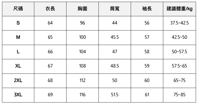 此處給出的參考尺寸表只是一個標準指南