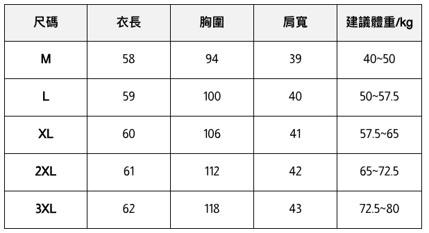 此處給出的參考尺寸表只是一個標準指南