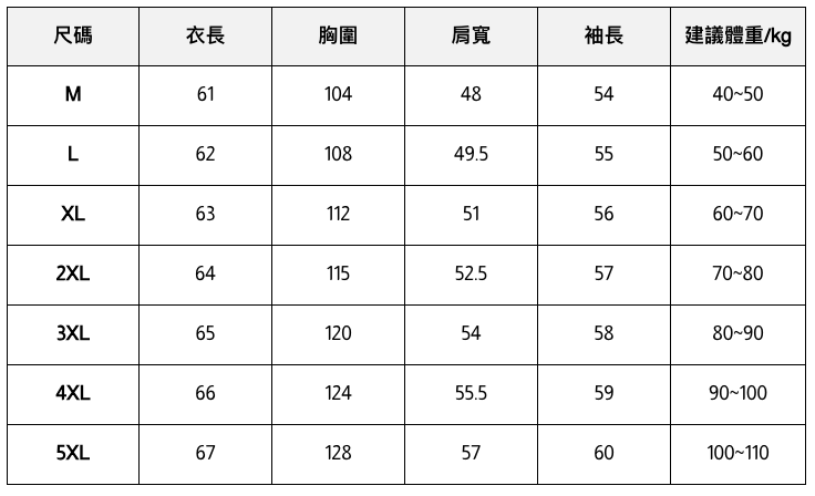 此處給出的參考尺寸表只是一個標準指南