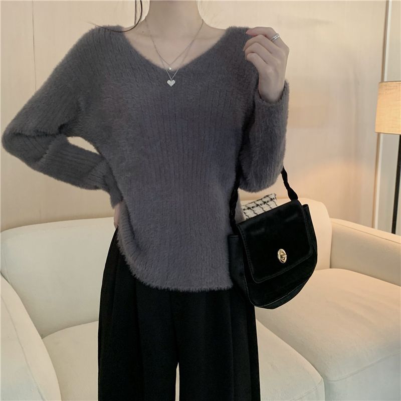 復古仿水貂毛V領軟糯寬鬆慵懶風內搭毛衣