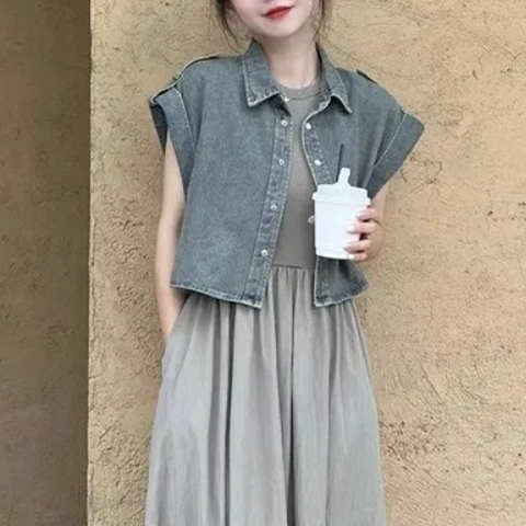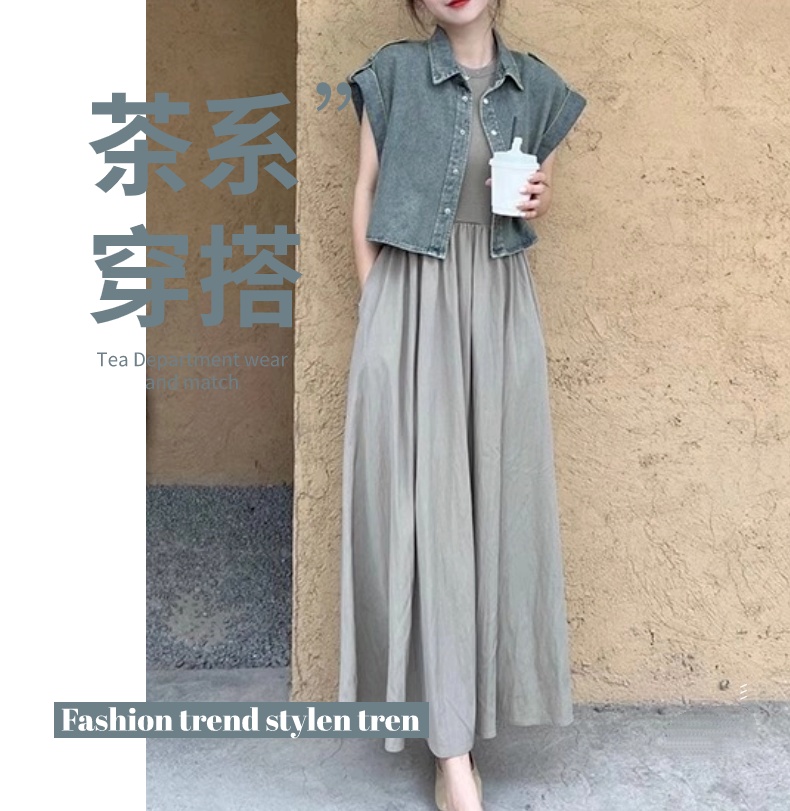 【單件/整套】法式輕熟風坎肩牛仔馬甲+背心連身裙兩件套裝