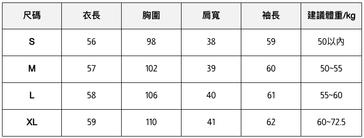 此處給出的參考尺寸表只是一個標準指南