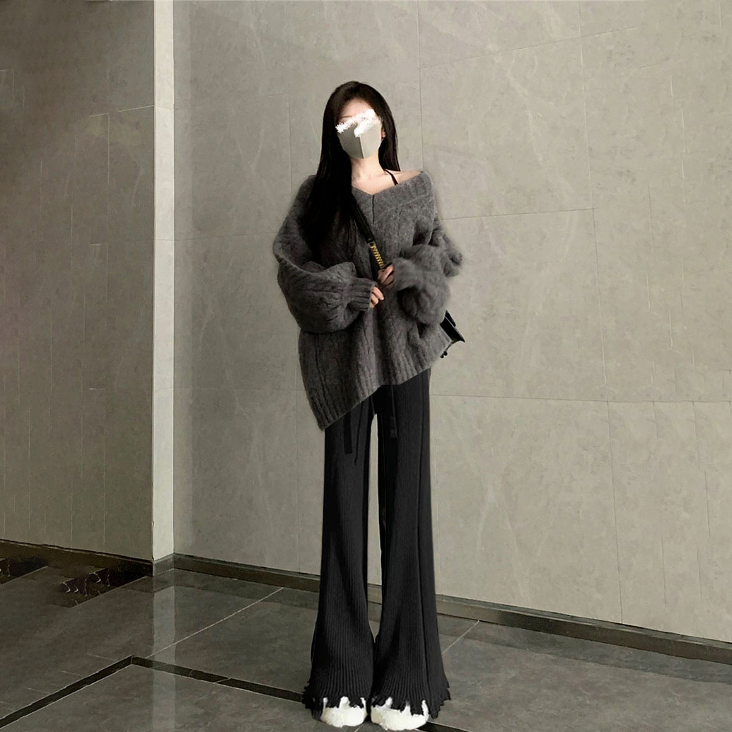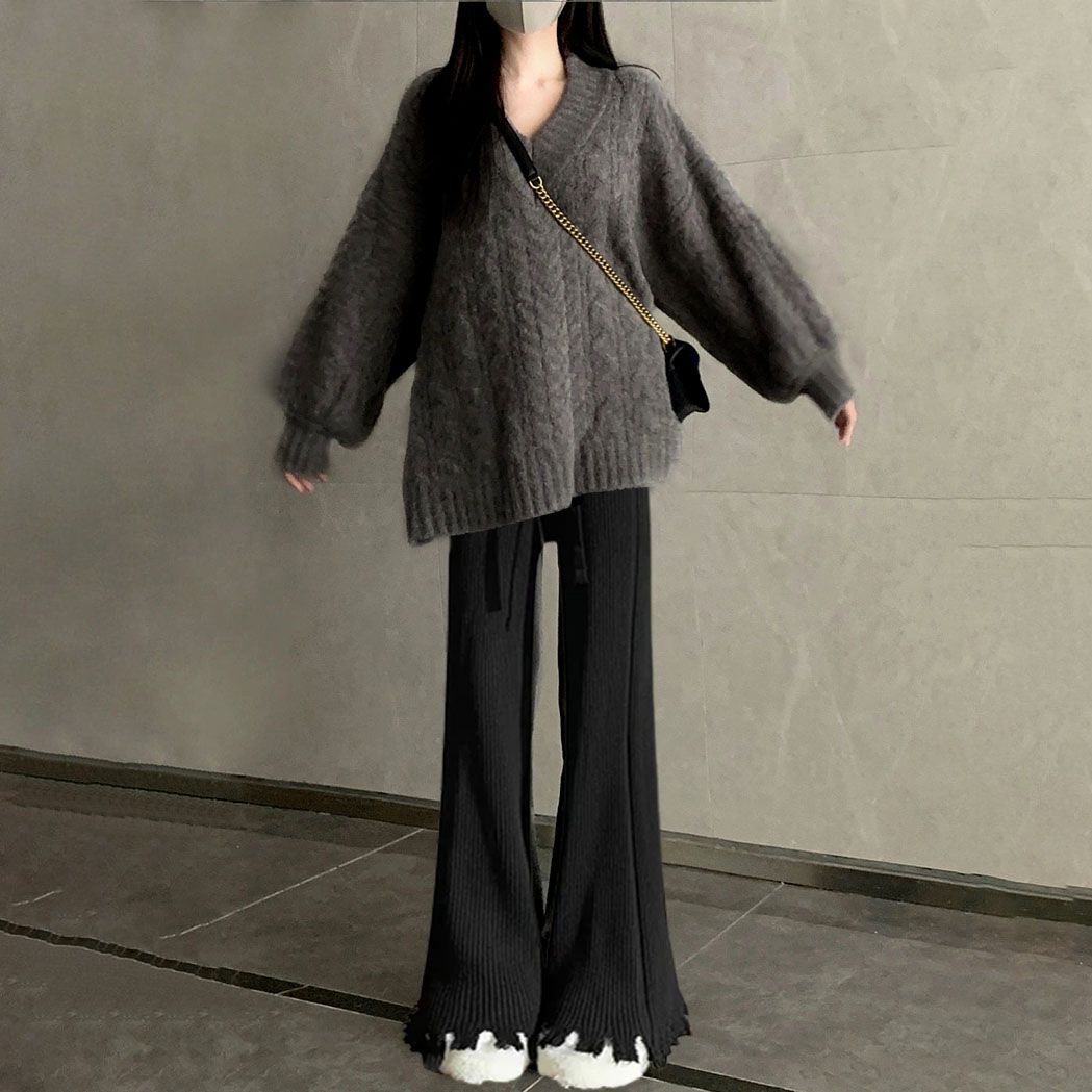 【單件/套裝】韓版慵懶風v領麻花毛衣+黑色針織褲兩件套