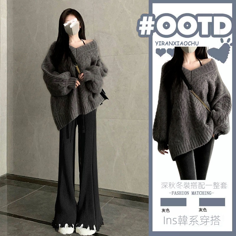 【兩件套】灰色毛衣+黑色針織褲