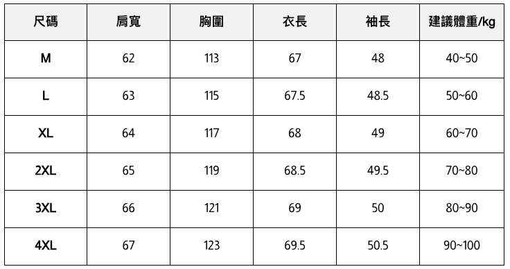 此處給出的參考尺寸表只是一個標準指南