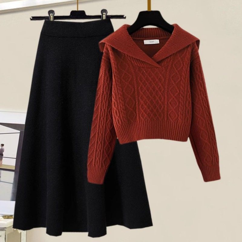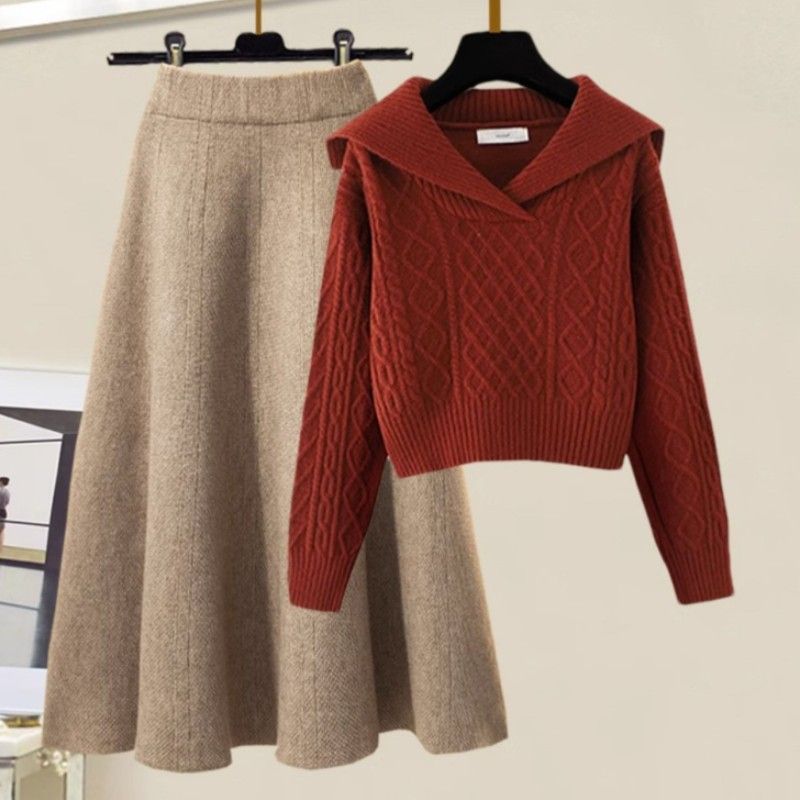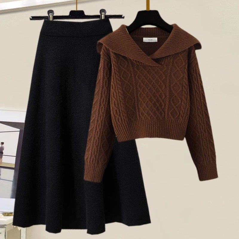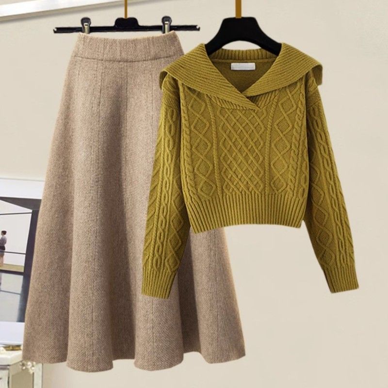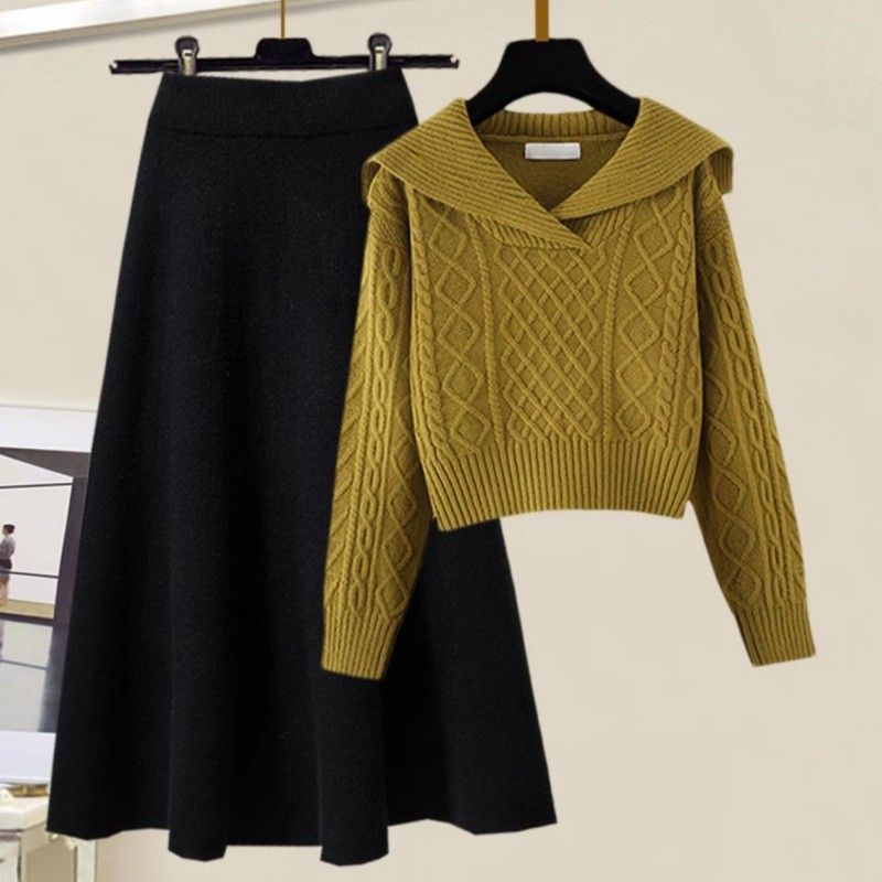 【單件/套裝】慵懶風娃娃領麻花毛衣+高腰A字針織半身裙兩件套