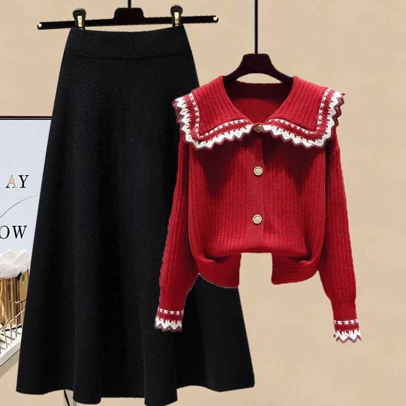 【兩件套】紅色毛衣+黑色半身裙