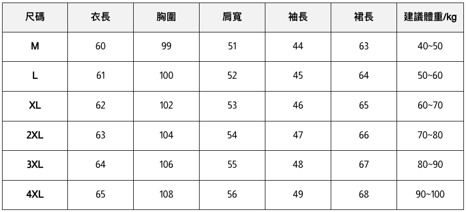 此處給出的參考尺寸表只是一個標準指南