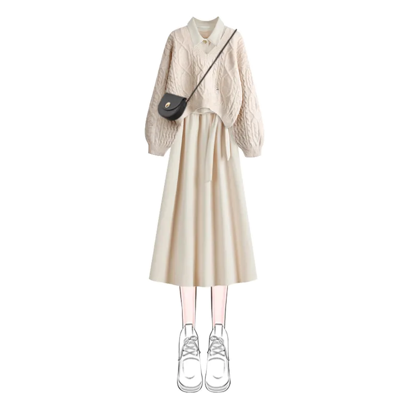 【單件/套裝】設計感慵懶風毛衣+寬鬆顯瘦襯衫洋裝兩件套