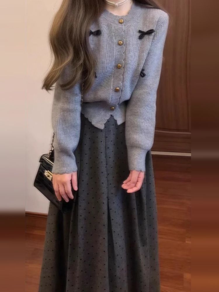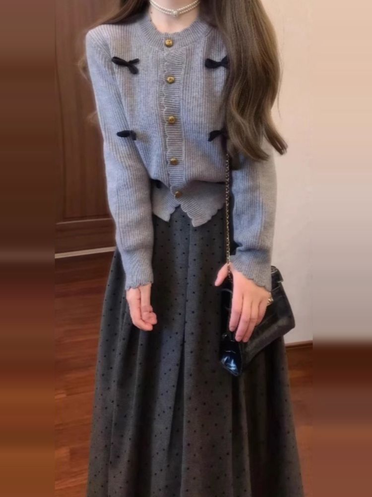 【單件/套裝】立體蝴蝶結針織開衫+波點半身裙兩件套裝