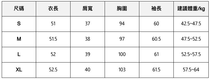 此處給出的參考尺寸表只是一個標準指南