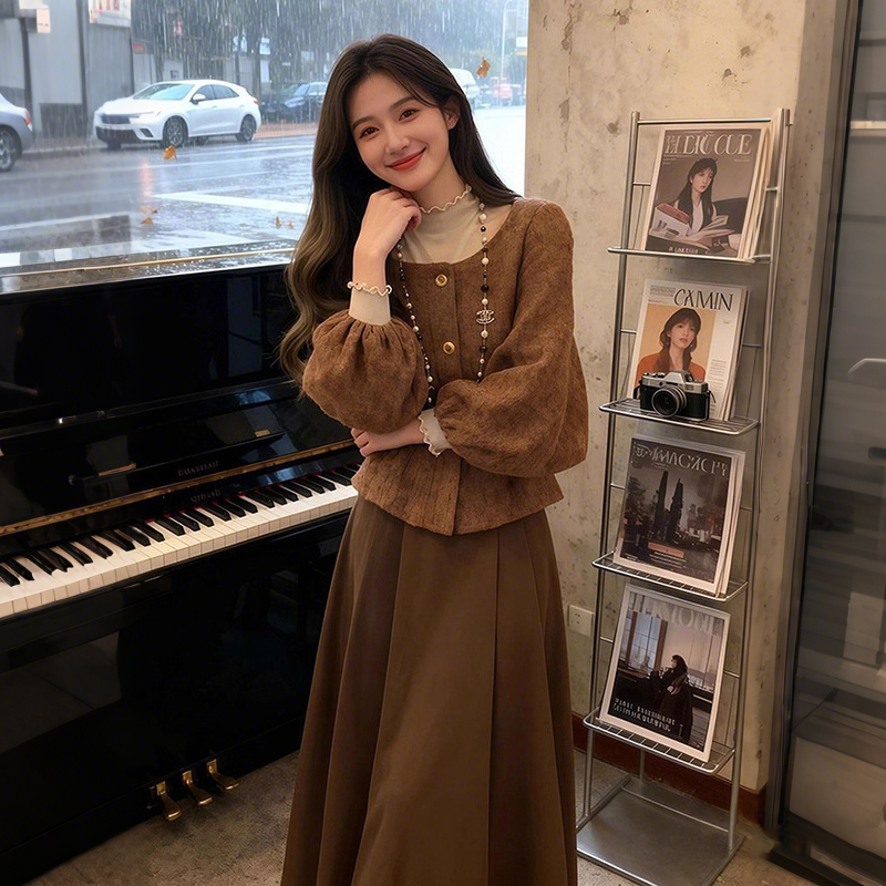 【單件/套裝】高級感氣質絕美燈籠袖上衣+咖色半身裙兩件套