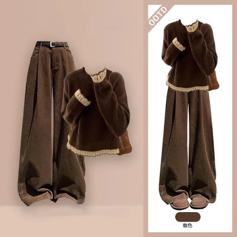 【兩件套】咖色毛邊毛衣+棕色燈芯尼褲