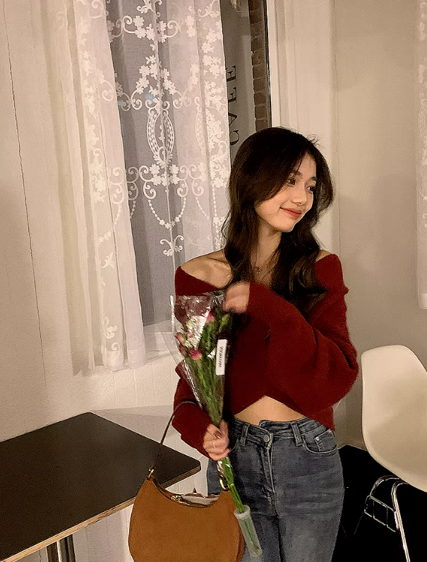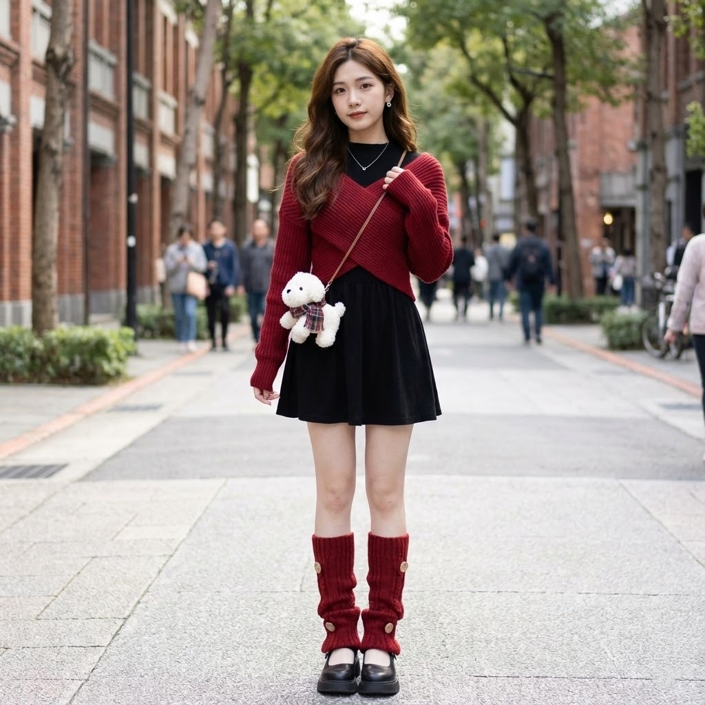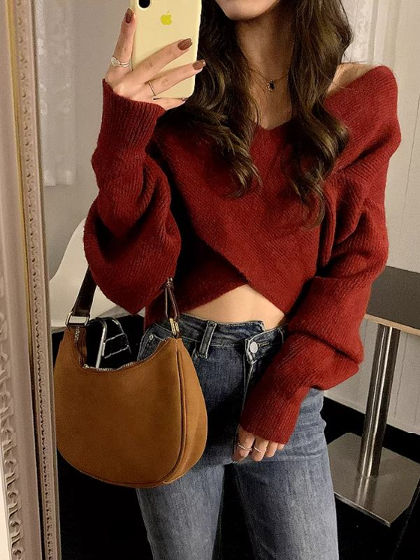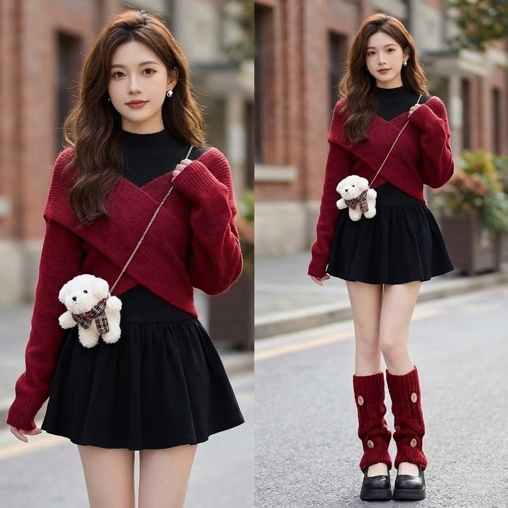 【兩件套】紅色交叉毛衣+黑色蓬松短裙