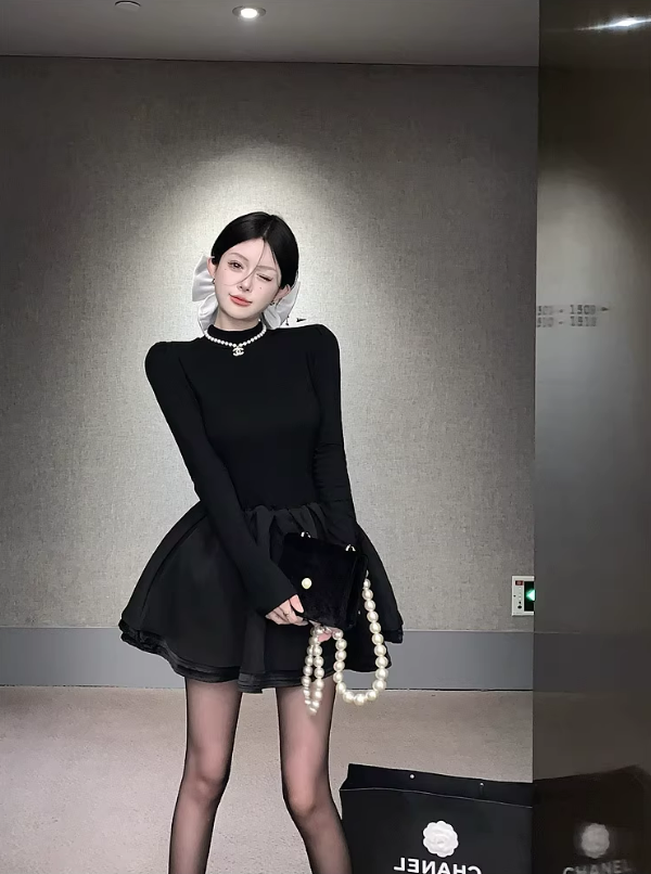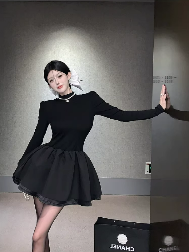 【兩件套】杏色交叉毛衣+黑色蓬松短裙