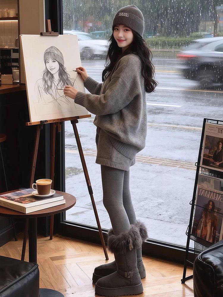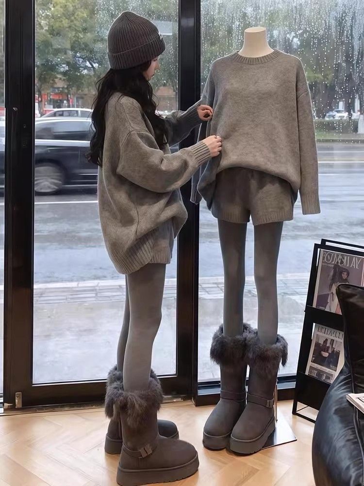 【整套】韓系慵懶針織年輕氣質寬鬆灰色毛衣+時尚高腰短褲兩件套裝