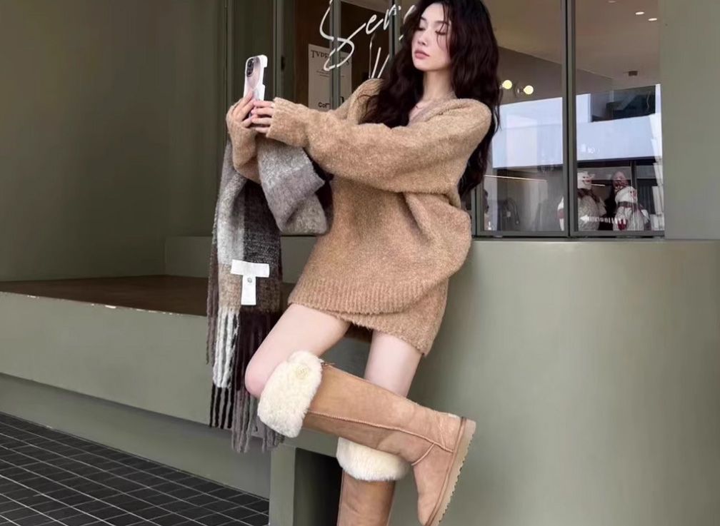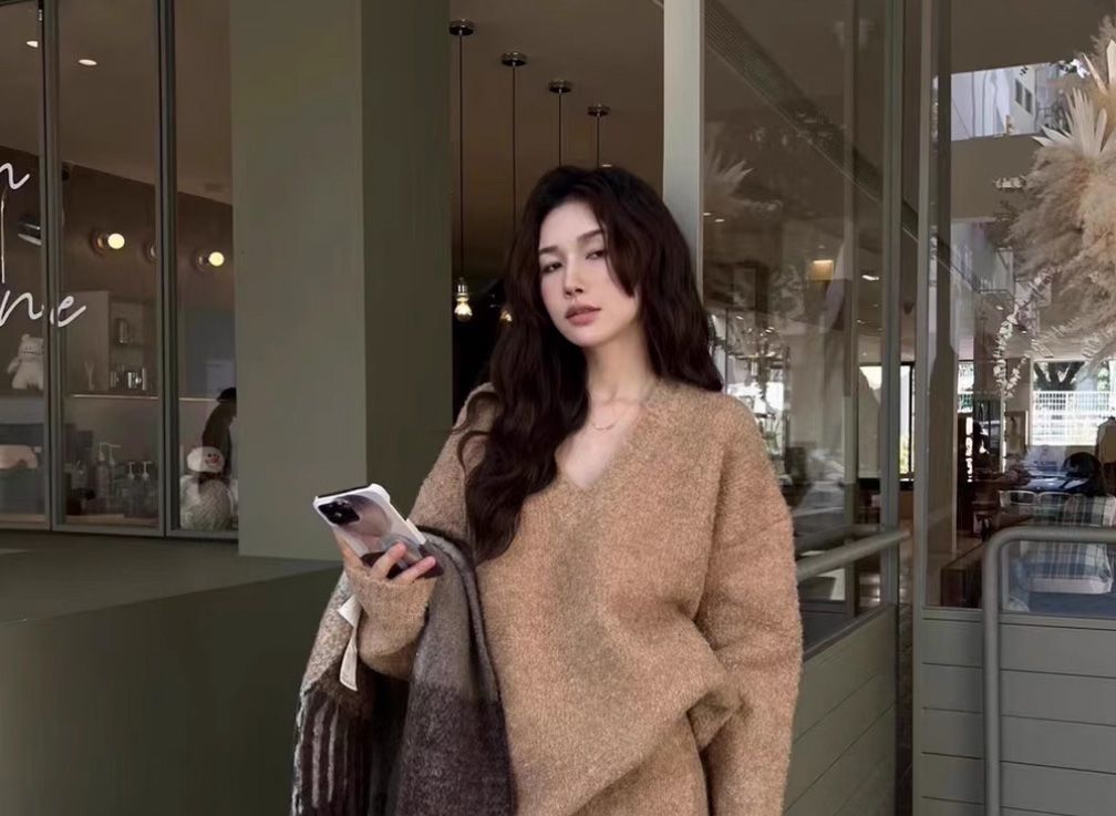 【整套】軟慵懶v領針織衫+顯瘦高腰半身裙兩件套