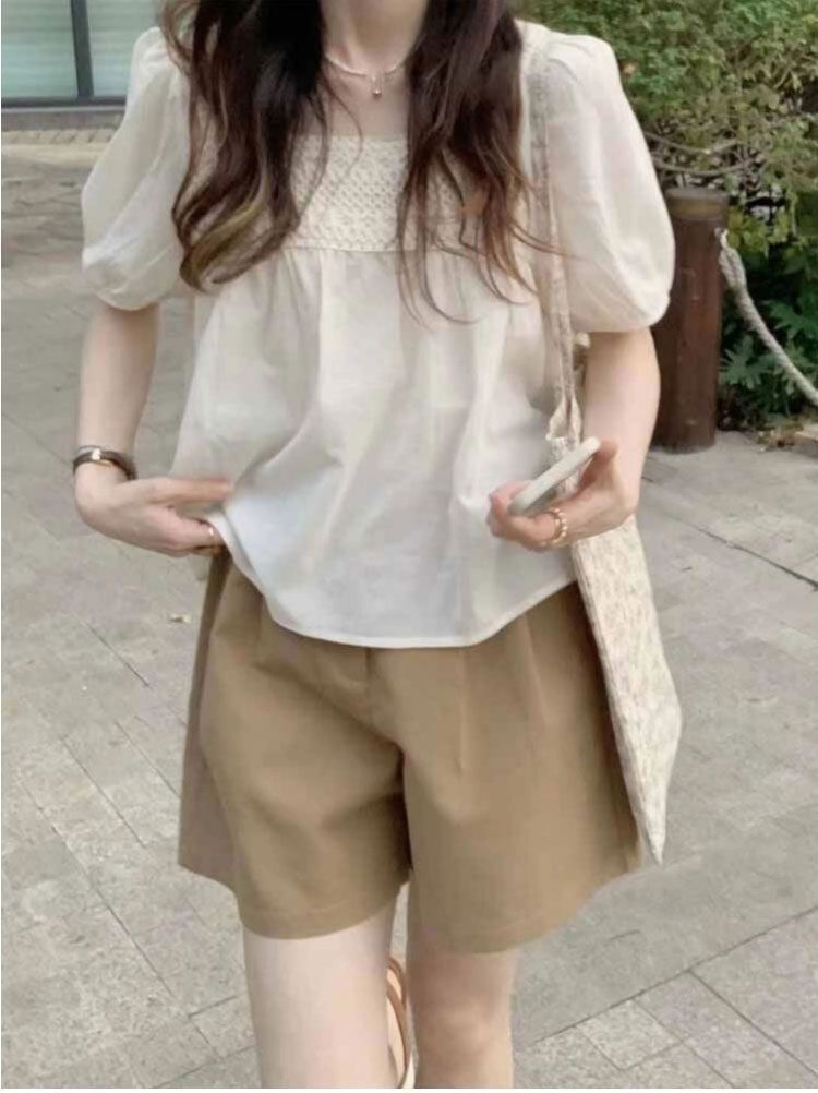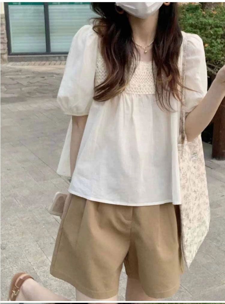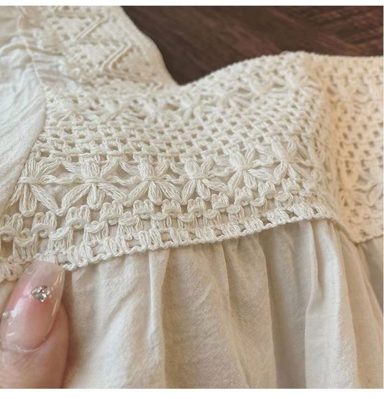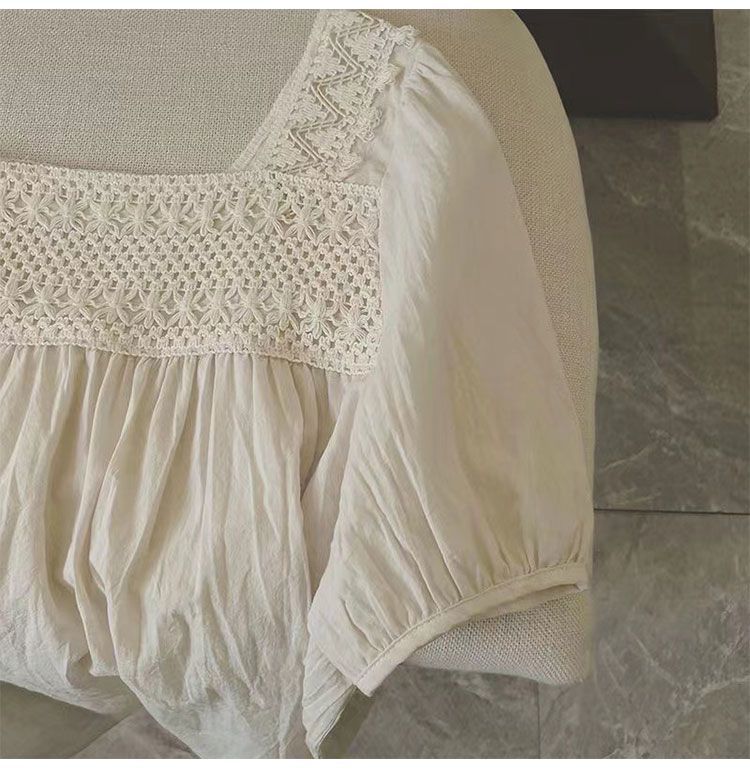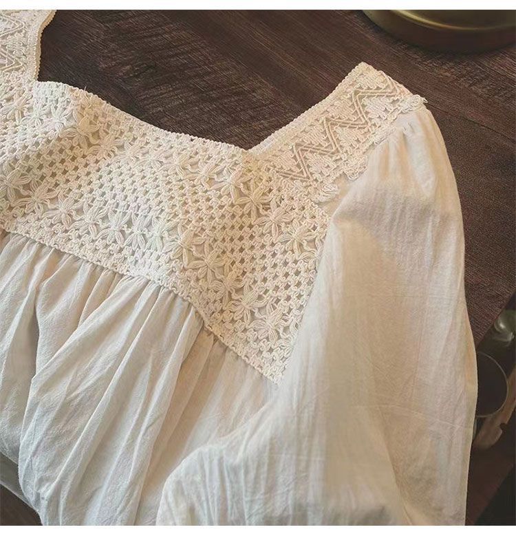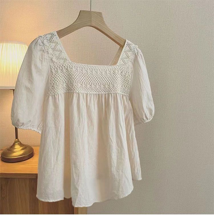 鏤空繡花設計感圓領寬鬆五分袖純棉襯衫