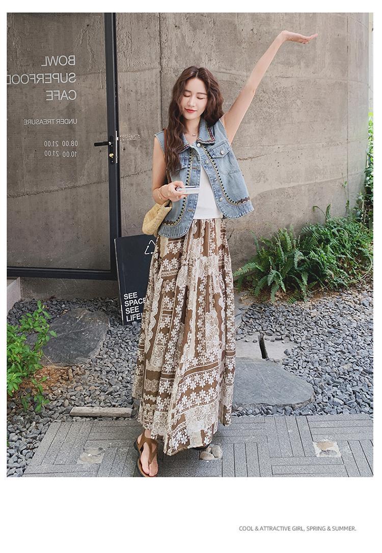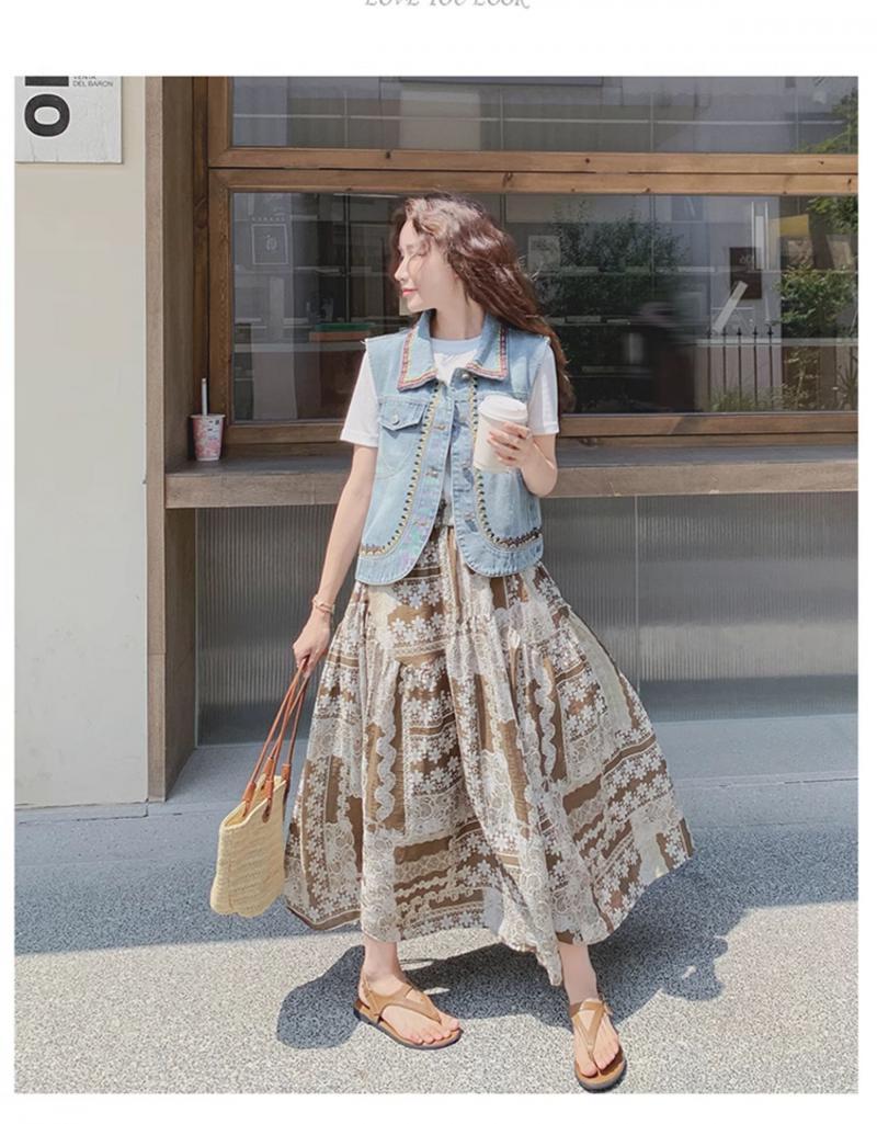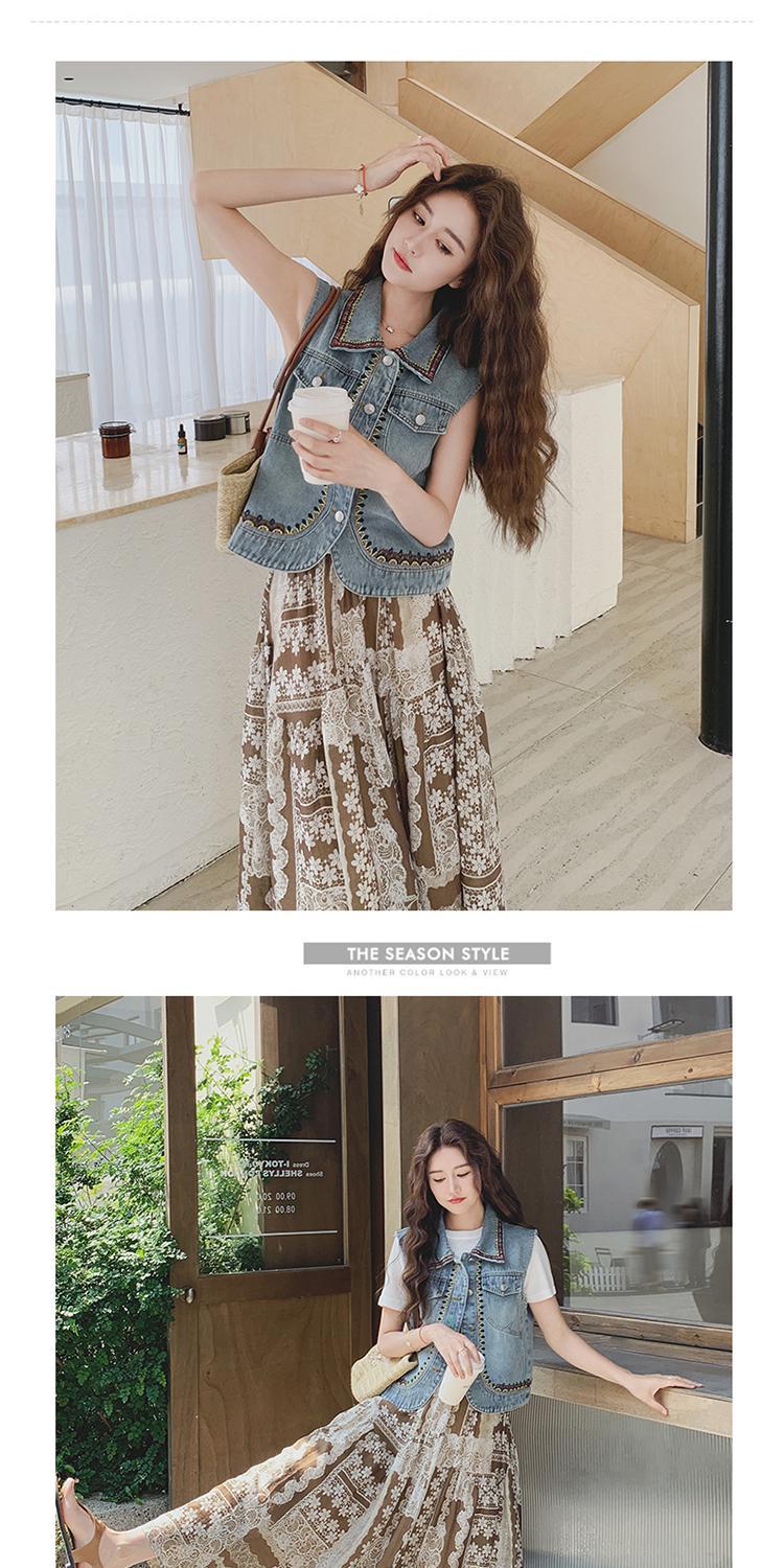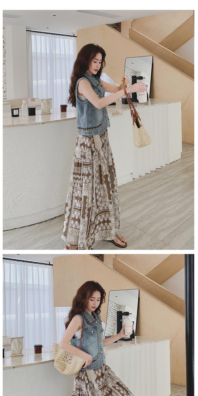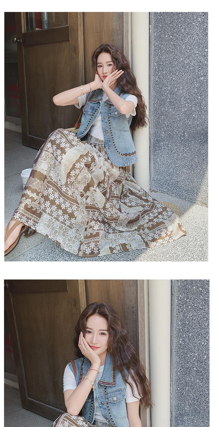 【單品/套裝】復古民族風刺繡牛仔馬甲半身裙兩件套裝