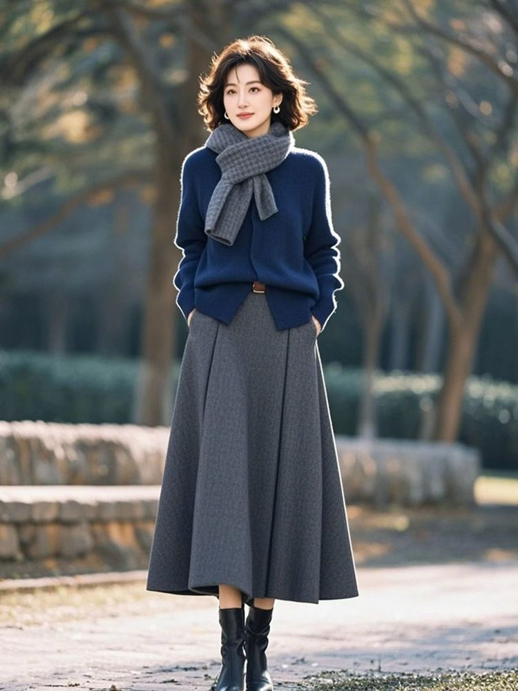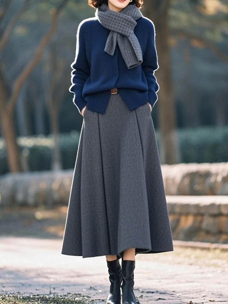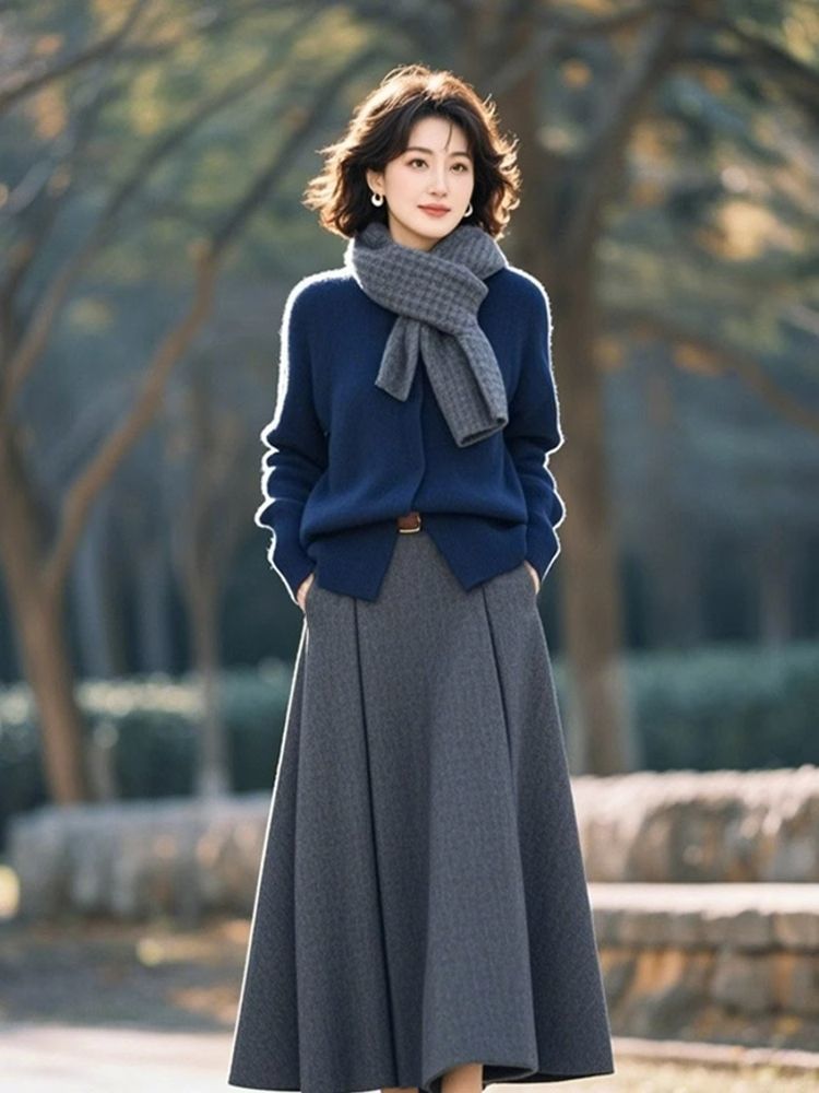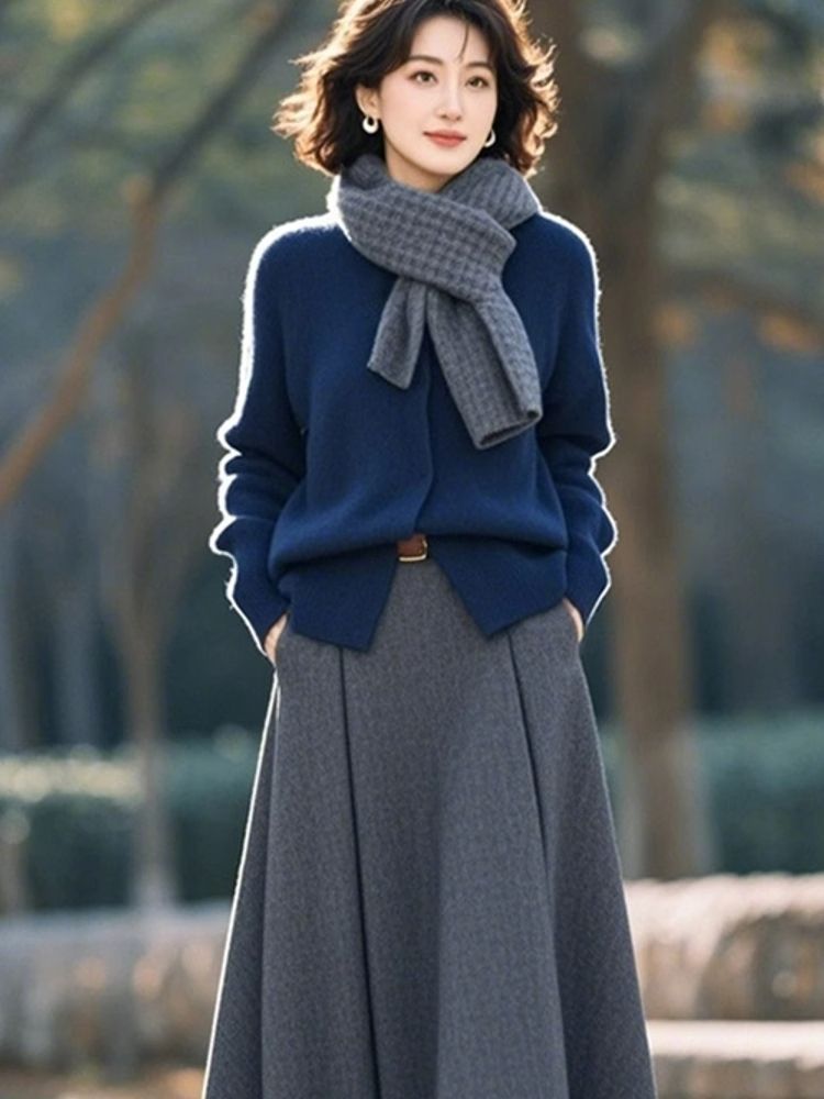 【兩件套】藍色毛衣+灰色半身裙