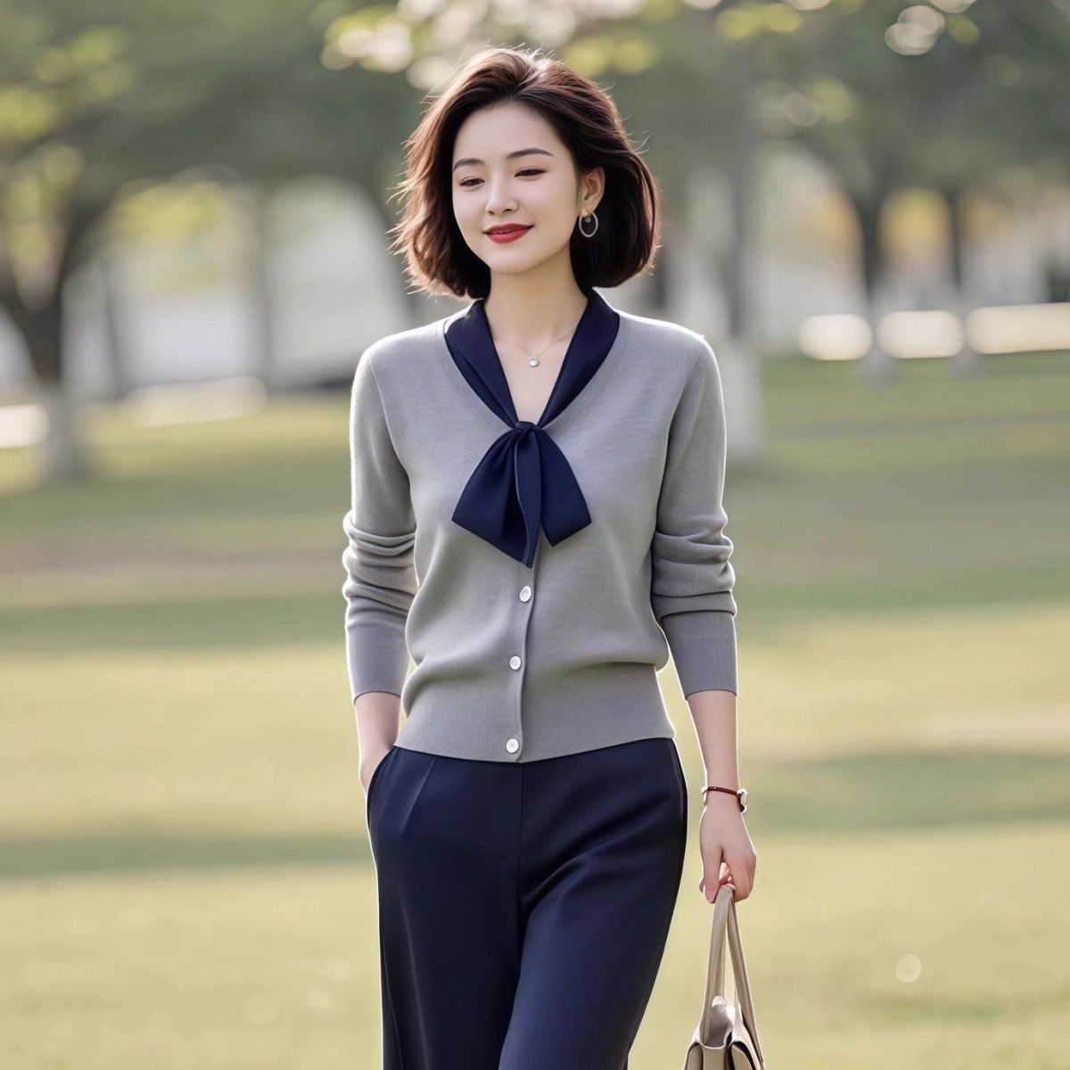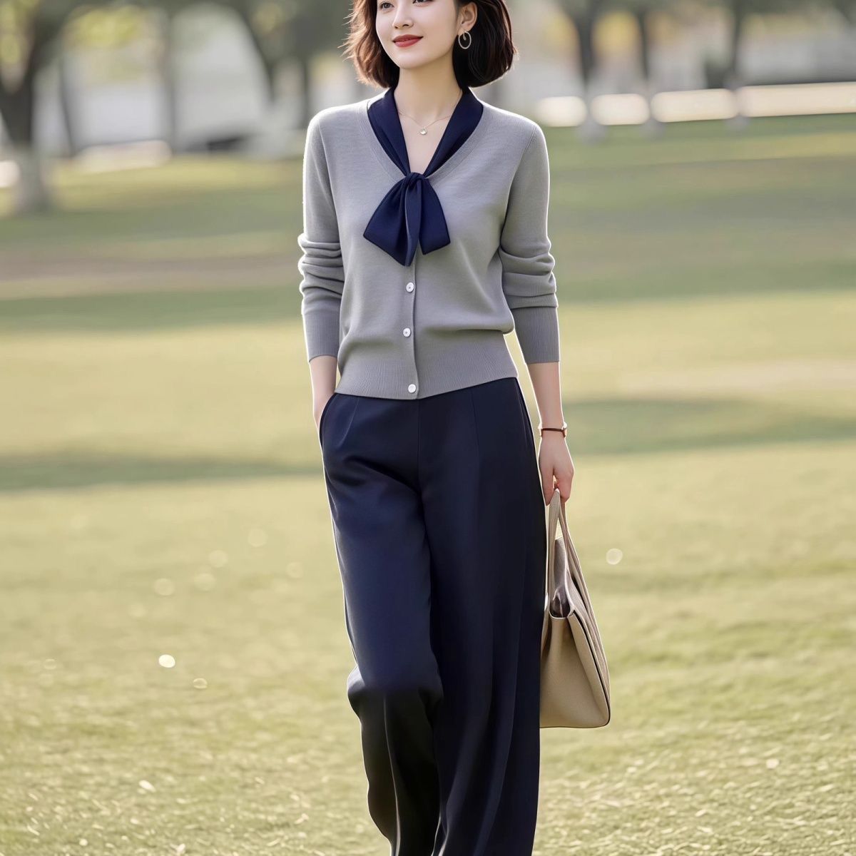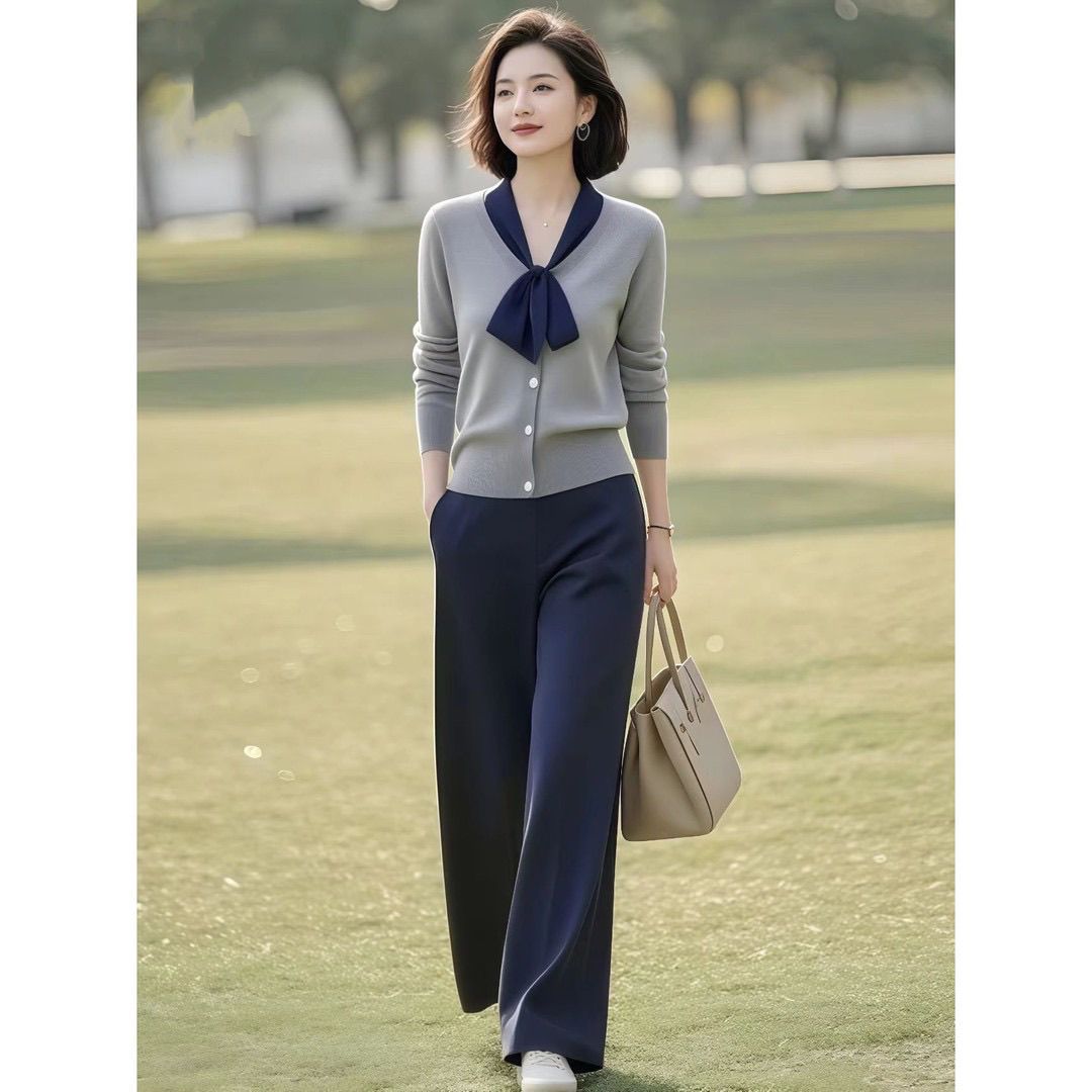【整套】高級通勤設計感拼接系帶針織上衣+直筒褲兩件套裝