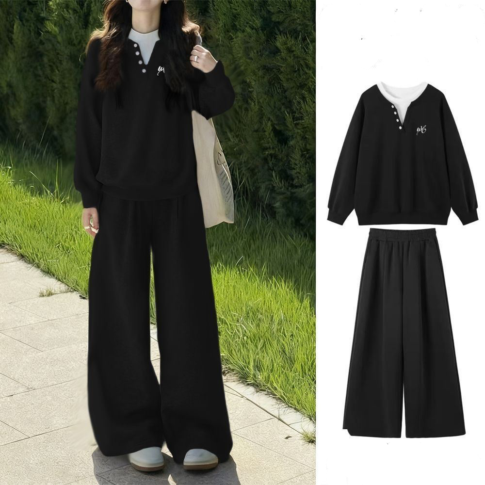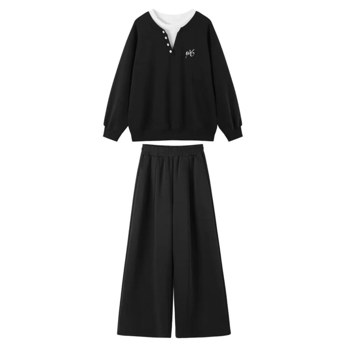 【套裝】黑色假兩件衛衣+黑闊腿褲【不加絨】