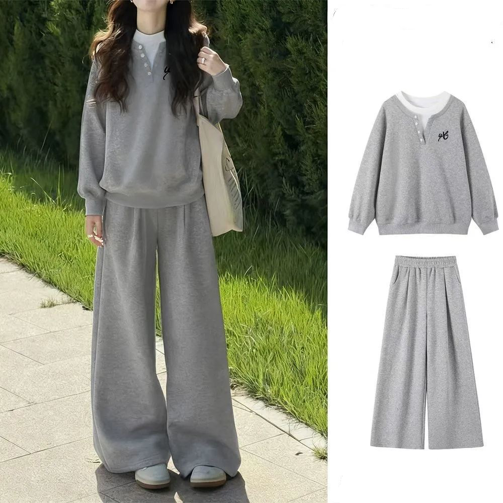 【套裝】灰色假兩件衛衣+灰闊腿褲【不加絨】