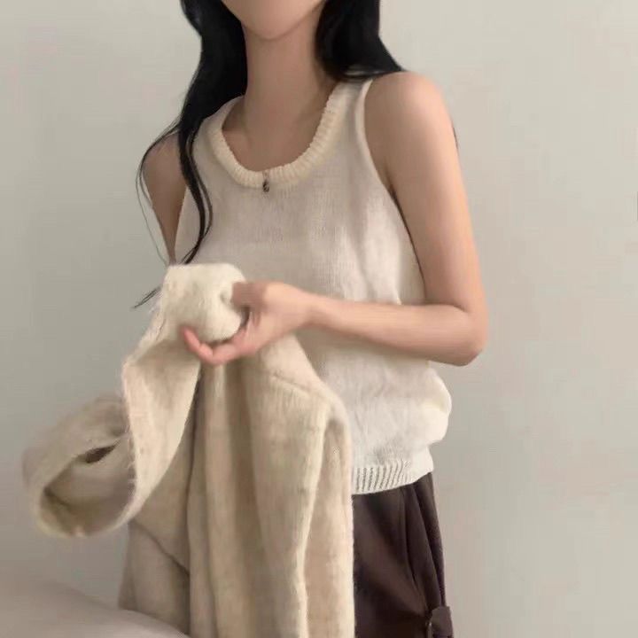 小香風氣質純色薄款釘珠針織背心