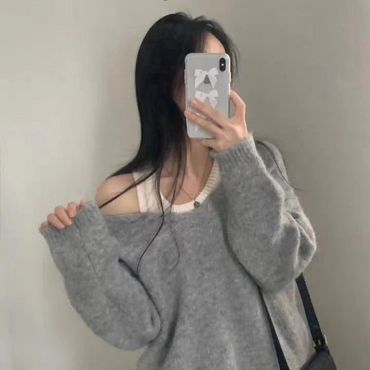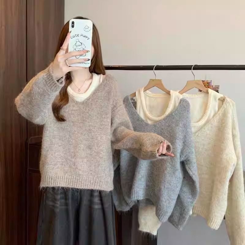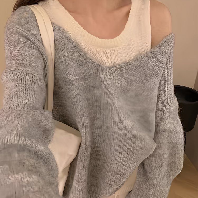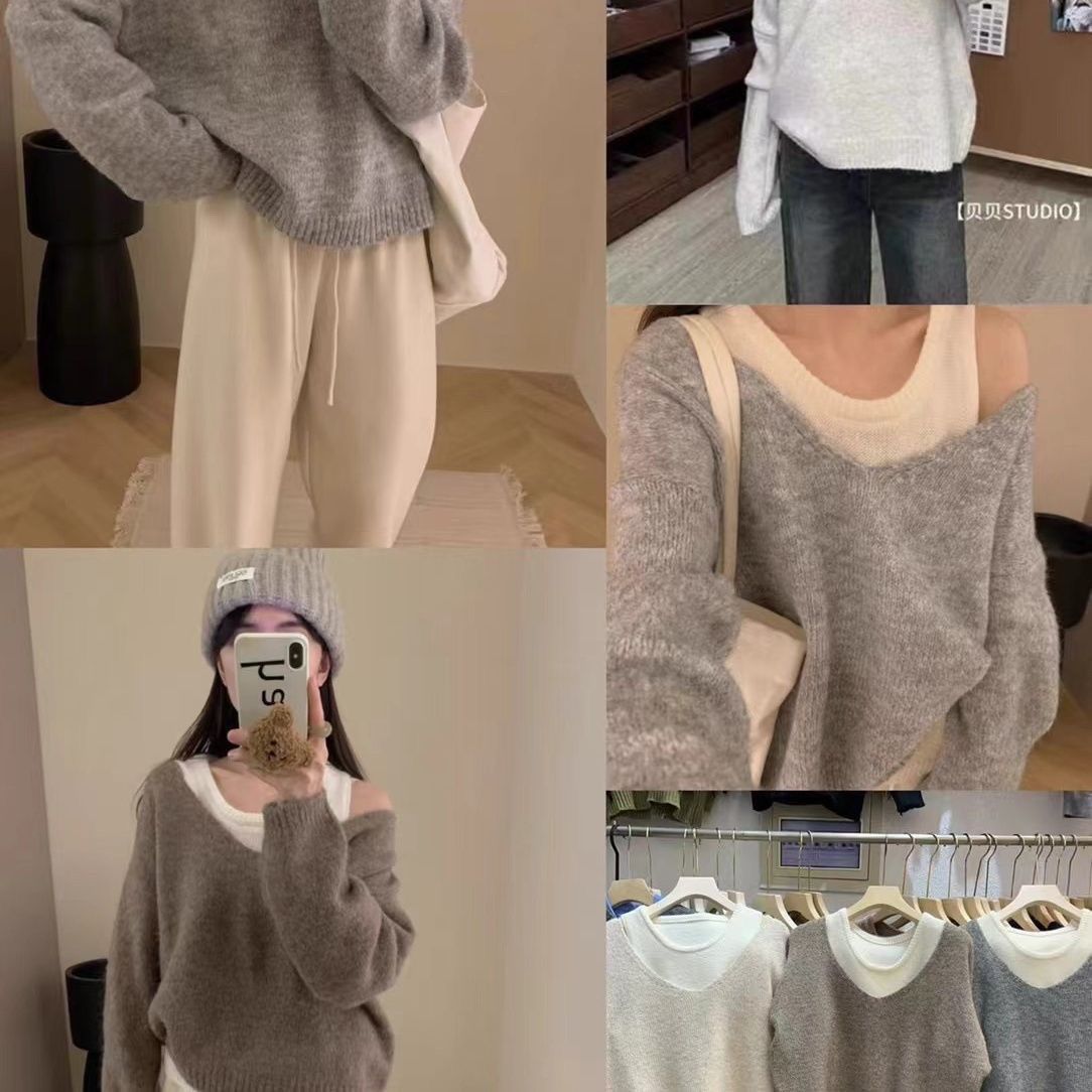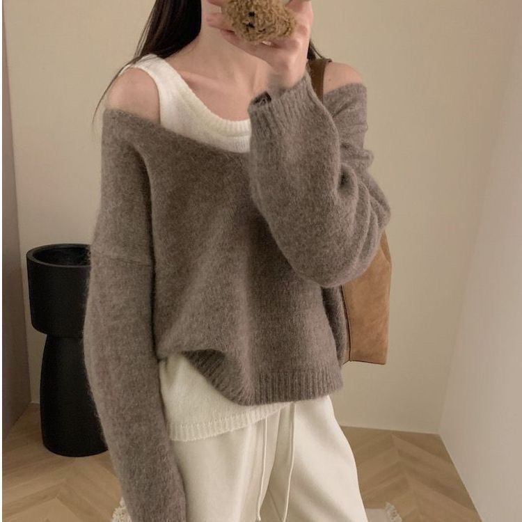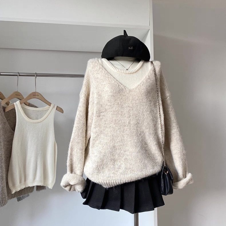 【套裝】韓版簡約軟糯針織背心+正肩針織衫兩件套裝