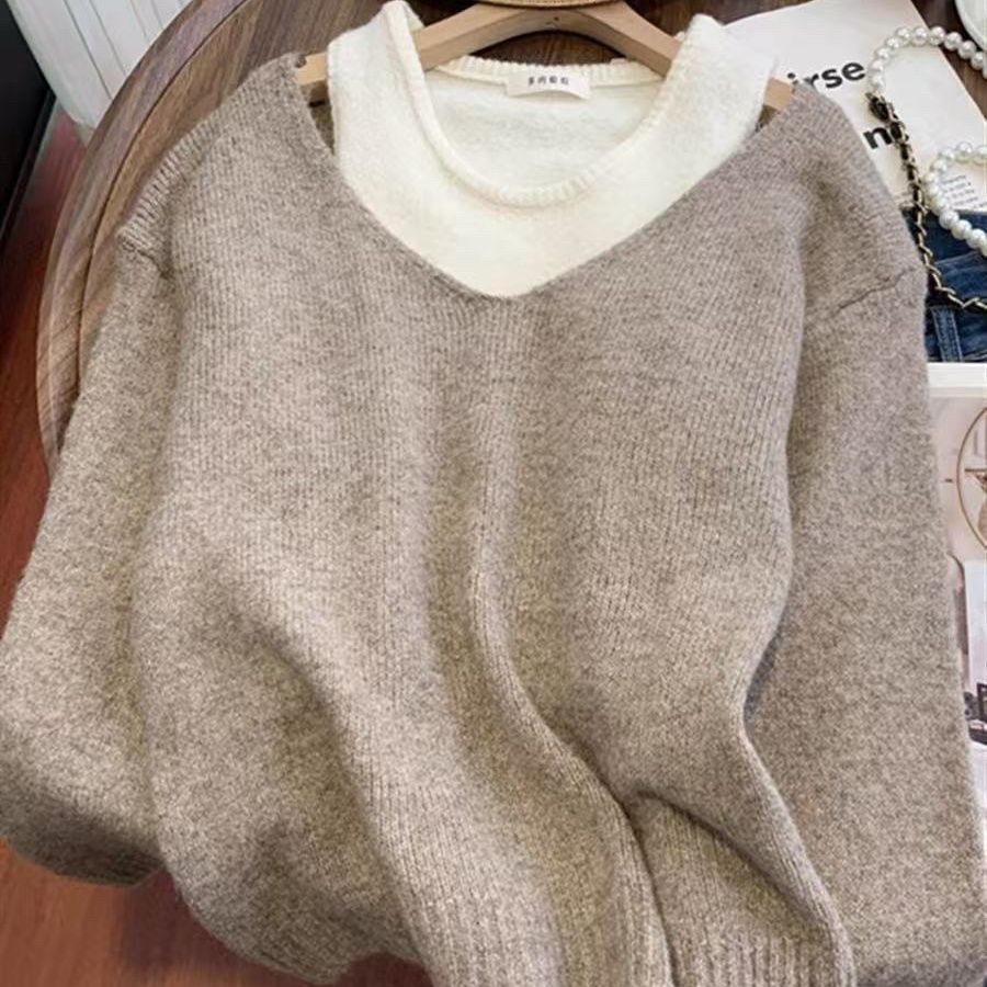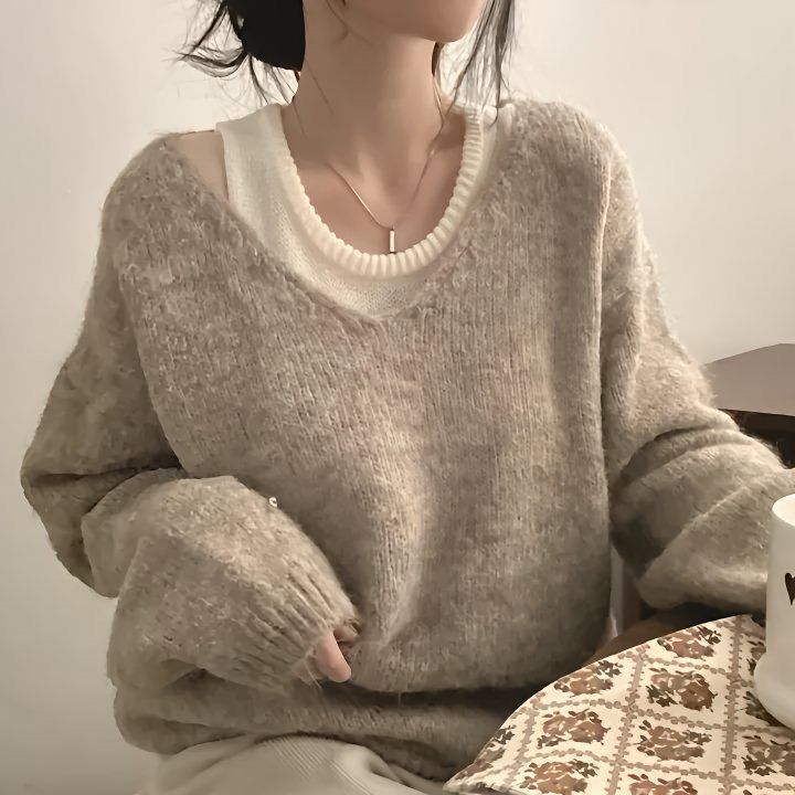 韓版寬鬆顯瘦套頭撞色v領針織衫