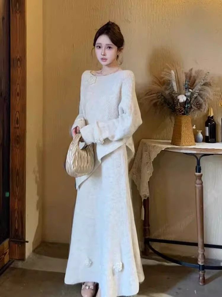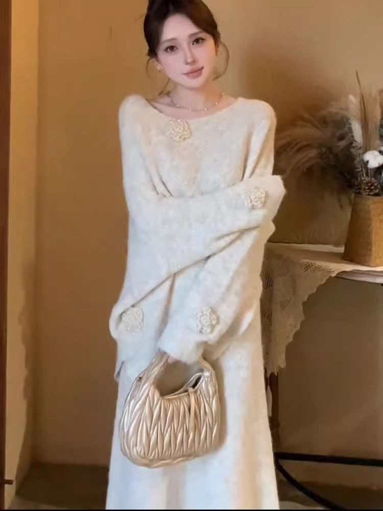 【整套】不規則花朵小香風千金禦姐毛衫+氣質連衣裙兩件套