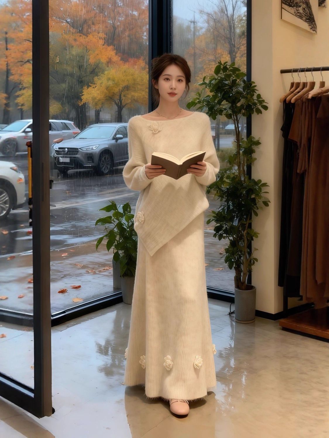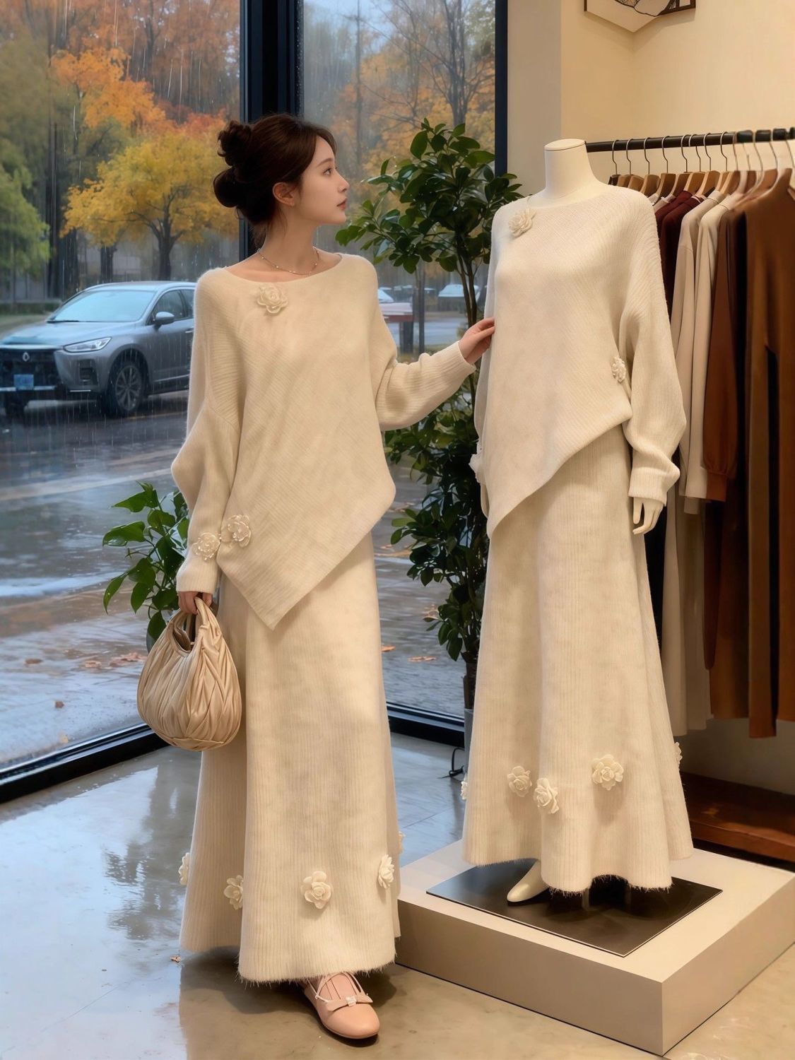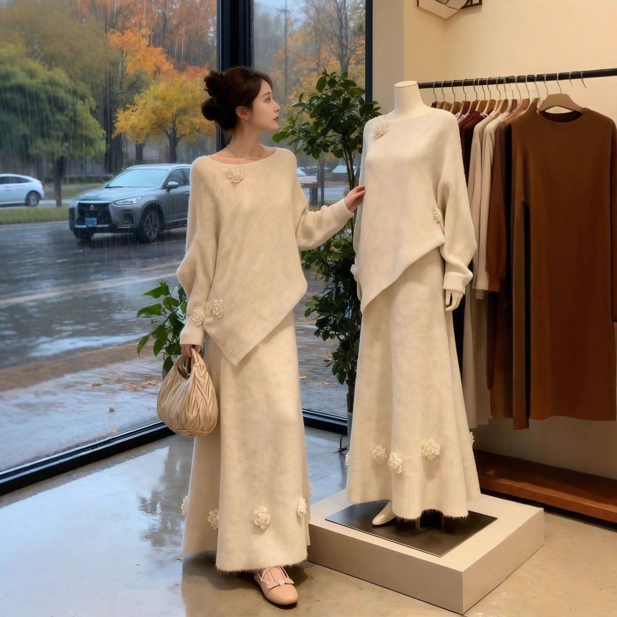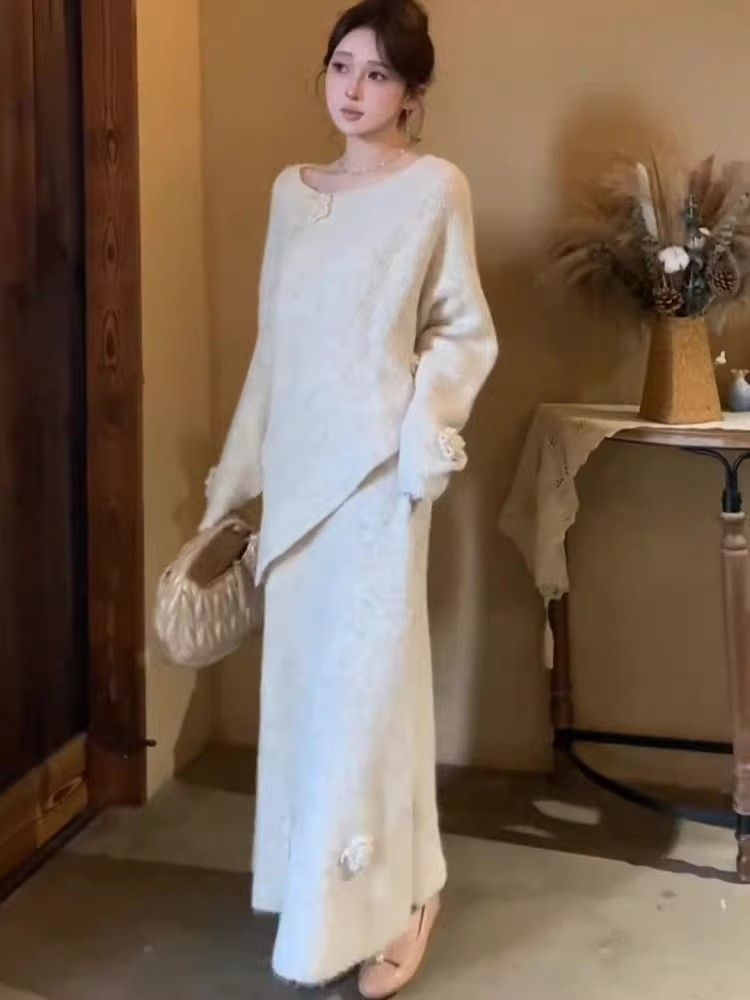 【整套】不規則花朵小香風針織衫+氣質半身裙兩件套