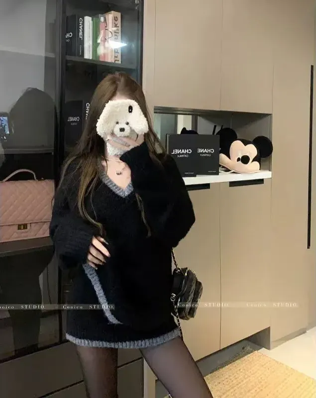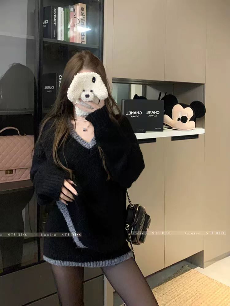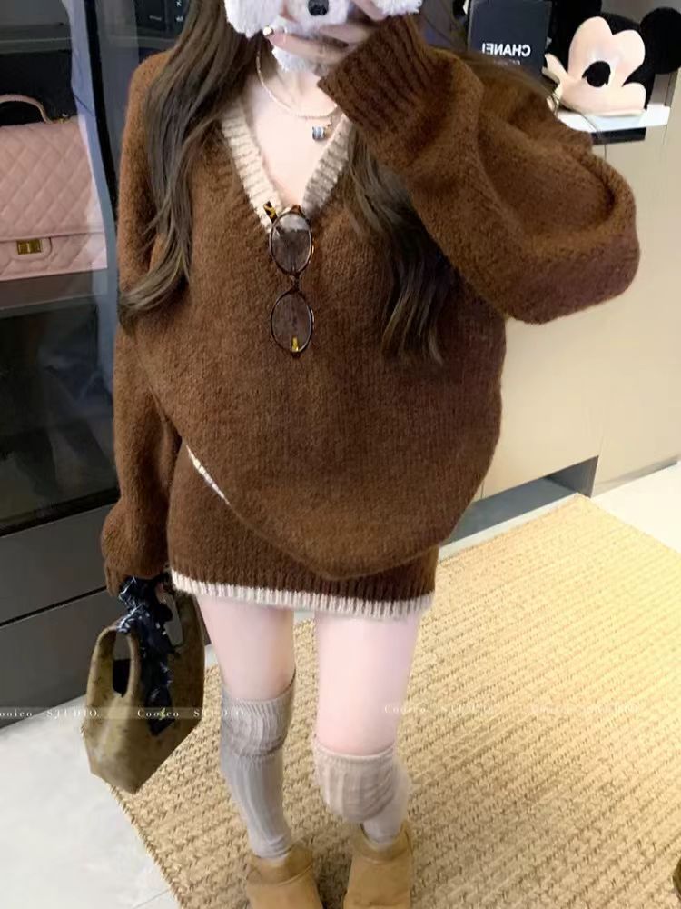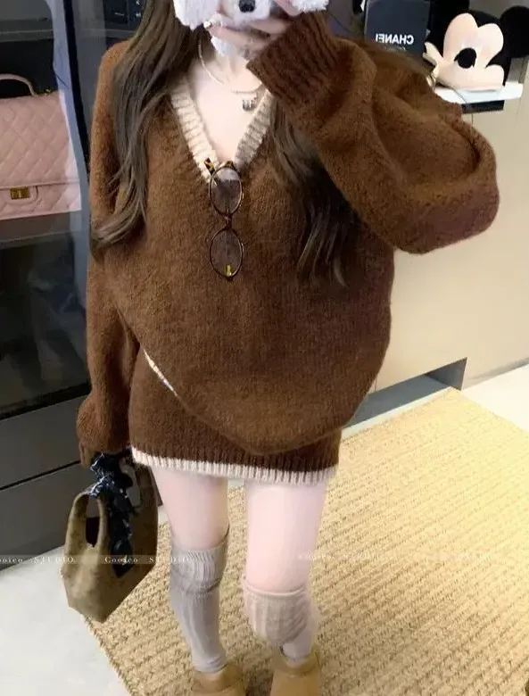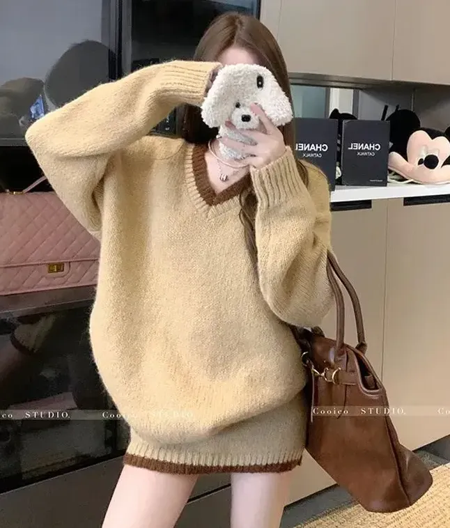 韓版寬鬆顯瘦套頭撞色v領針織衫