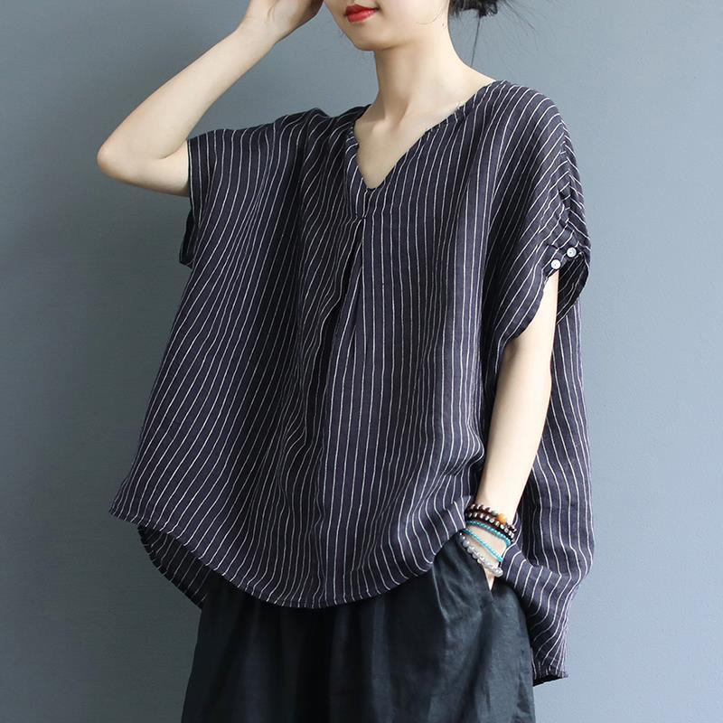 簡約涼感寬鬆文藝條紋遮肚棉麻襯衫