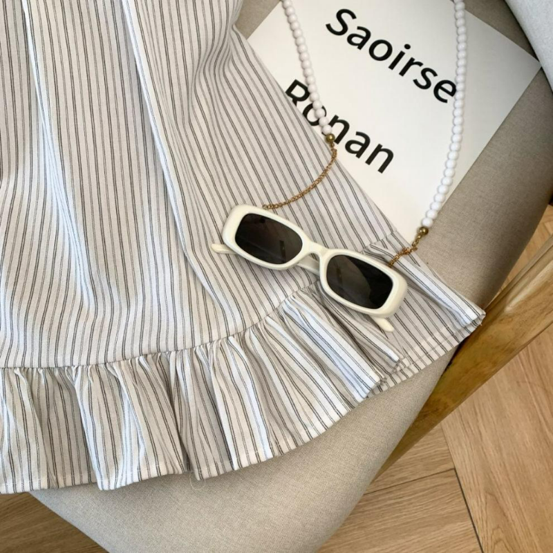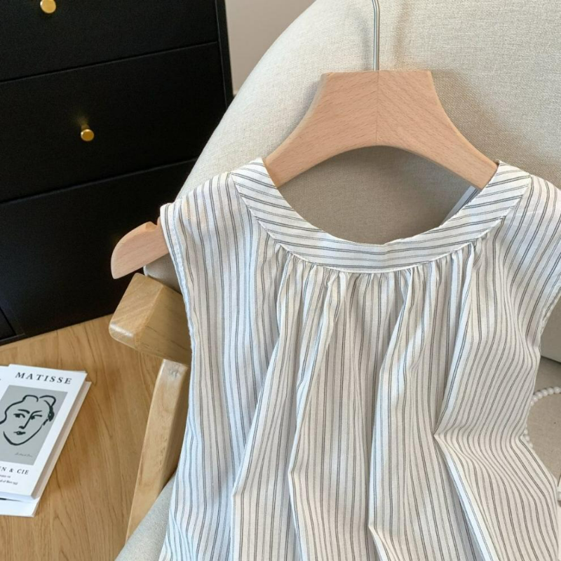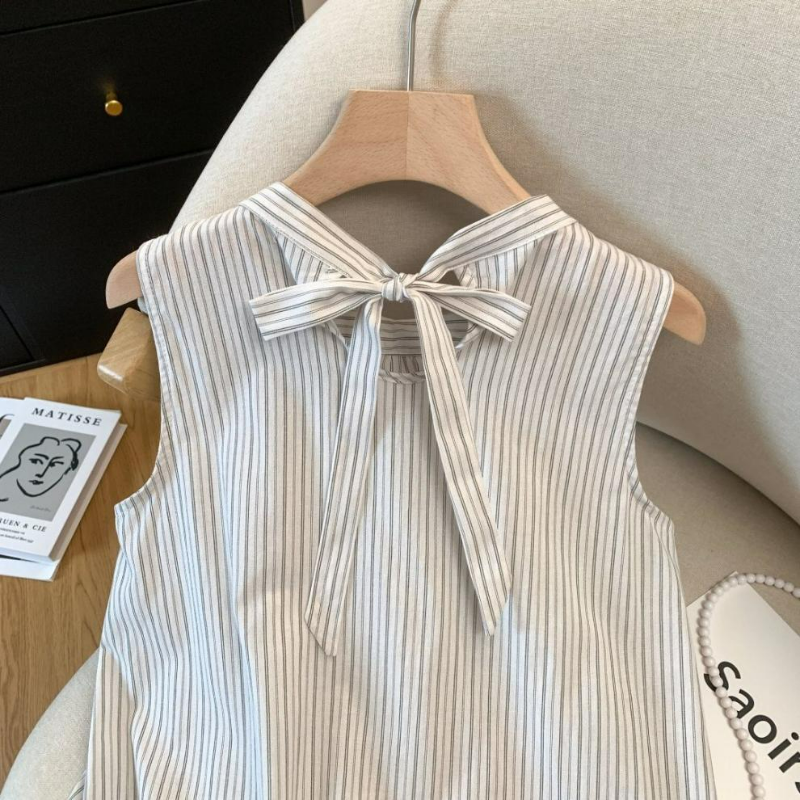 木耳邊擺掛脖蝴蝶結綁帶無袖條紋襯衫