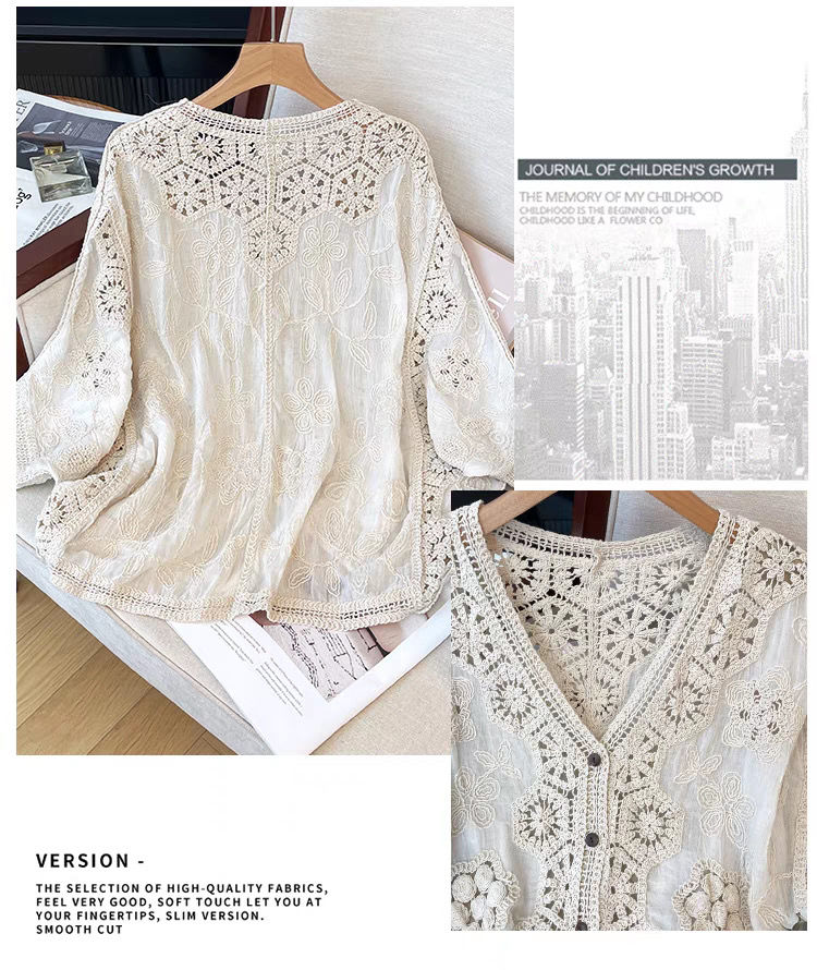 波西米亞風鉤花鏤空V領大碼防曬開衫襯衫