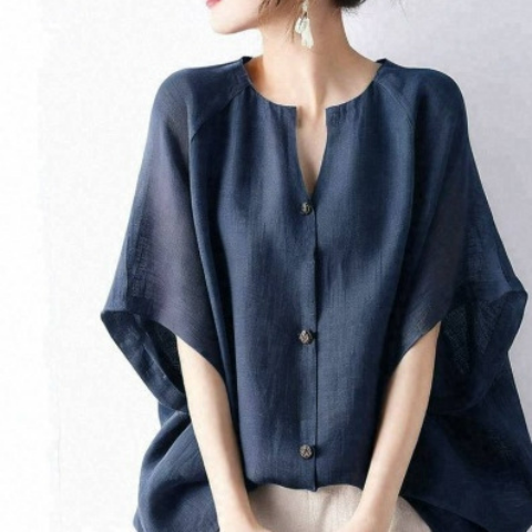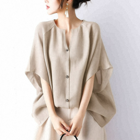 日韓休閑寬松圓領門襟系扣中袖純色襯衫