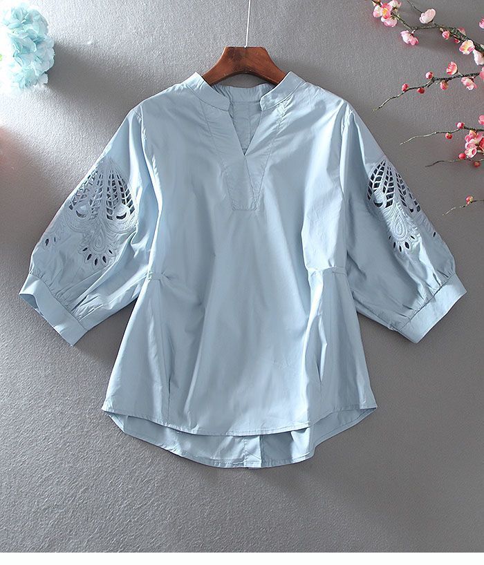 純棉V領氣質中袖鏤空大碼顯瘦襯衫