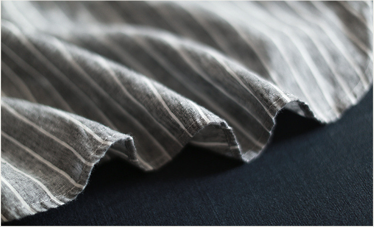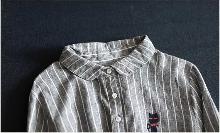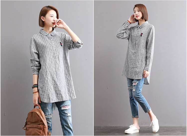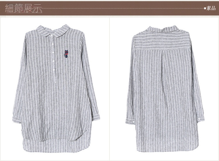 寬鬆中長款刺繡條紋長袖棉質娃娃領襯衫