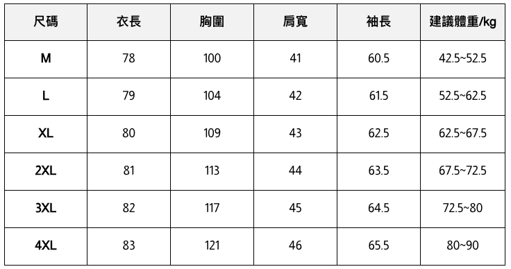 此處給出的參考尺寸表只是一個標準指南