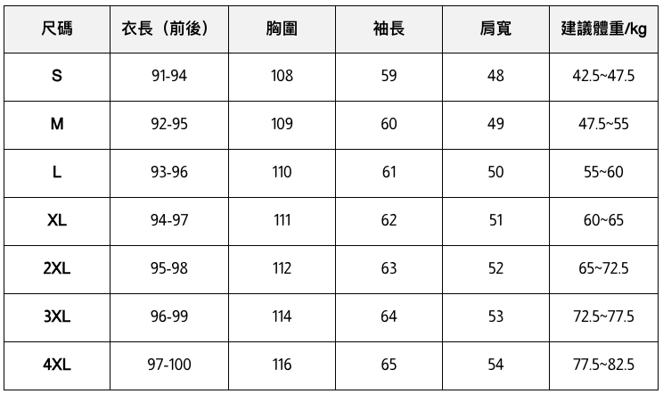 此處給出的參考尺寸表只是一個標準指南