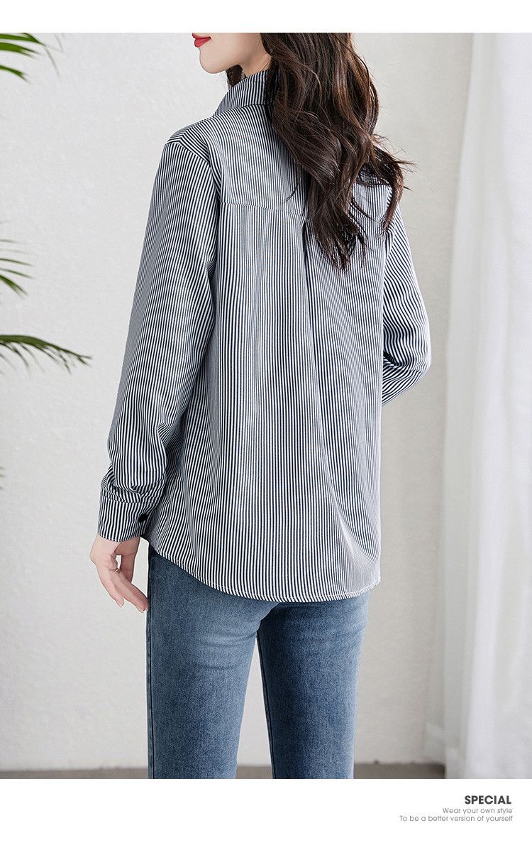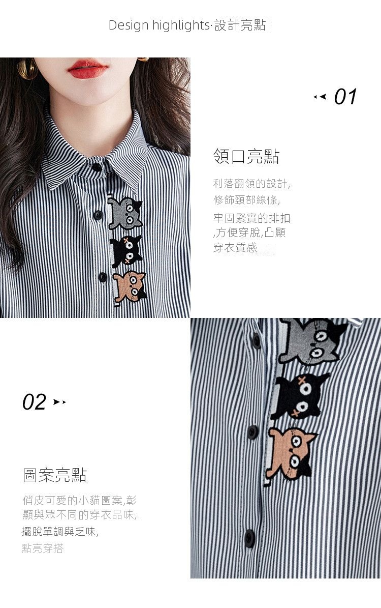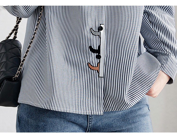 條紋翻領貓咪圖案刺繡通勤長袖氣質襯衫