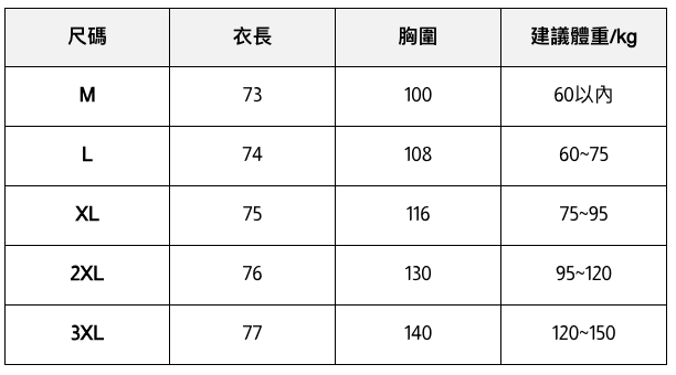 此處給出的參考尺寸表只是一個標準指南