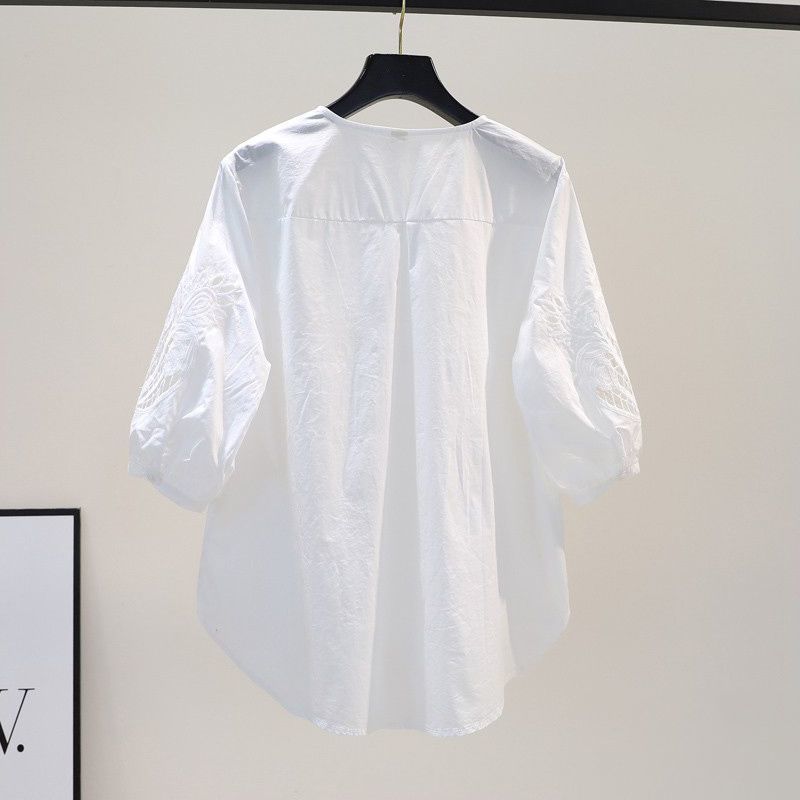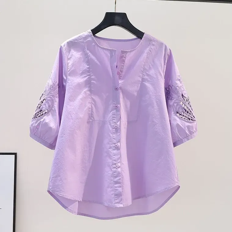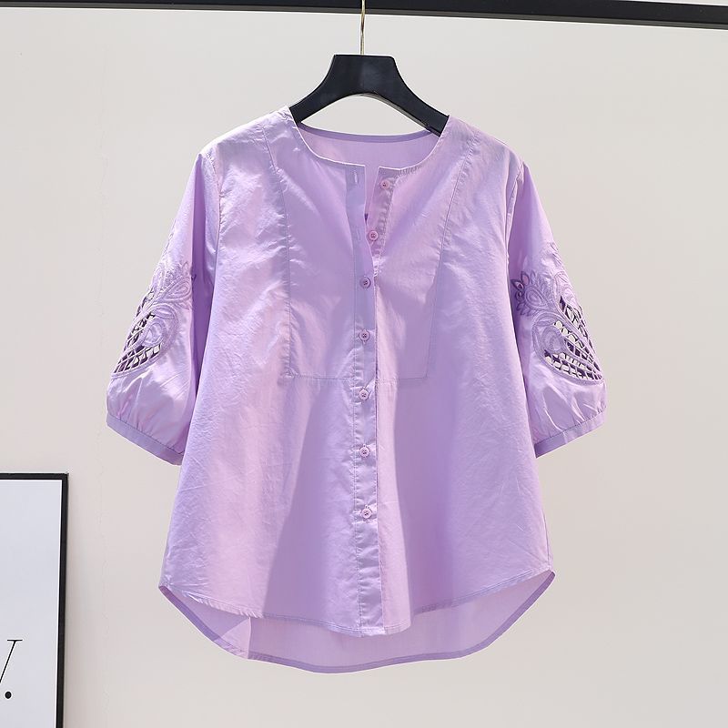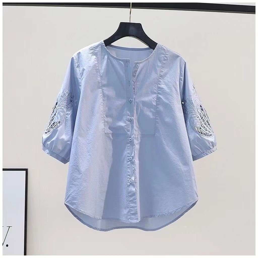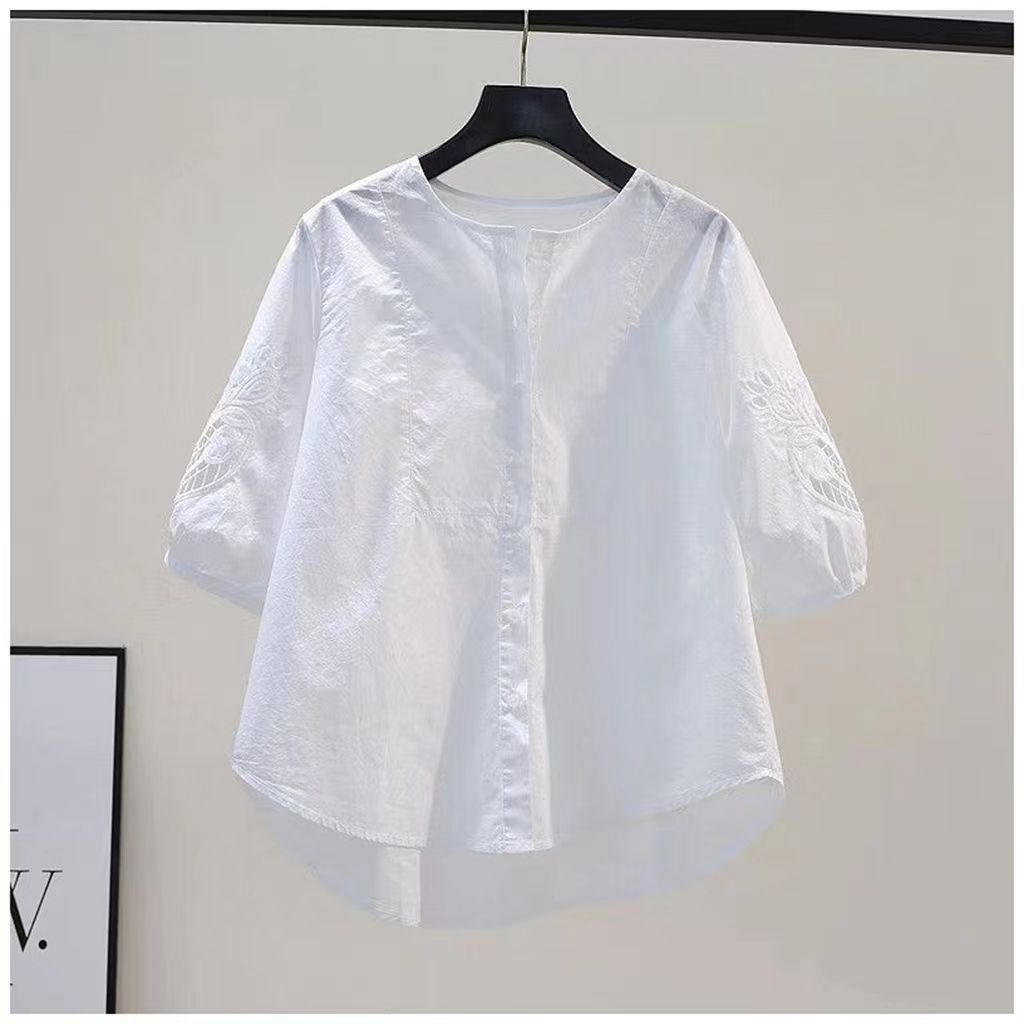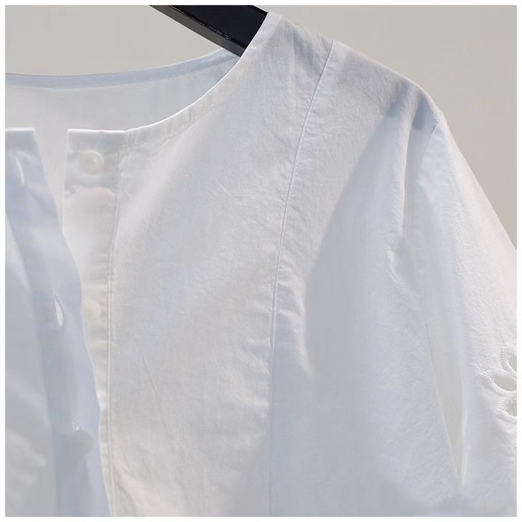 鏤空繡花設計感圓領寬鬆五分袖純棉襯衫