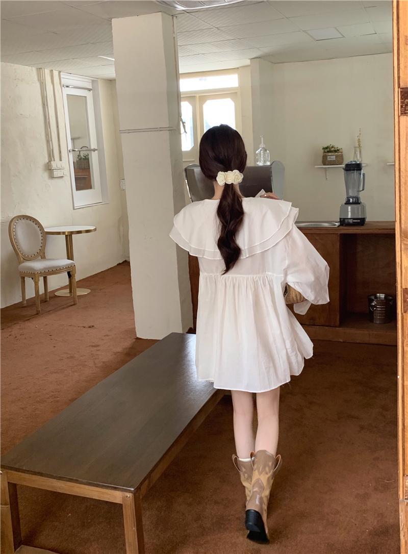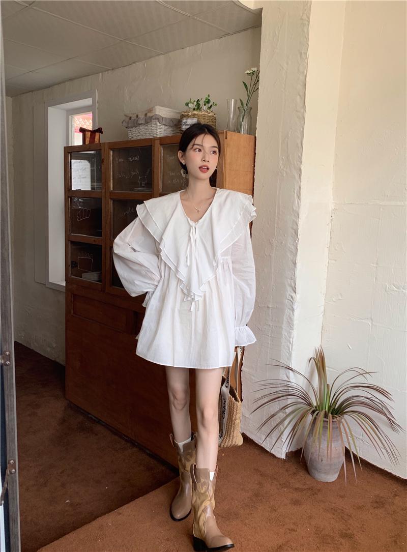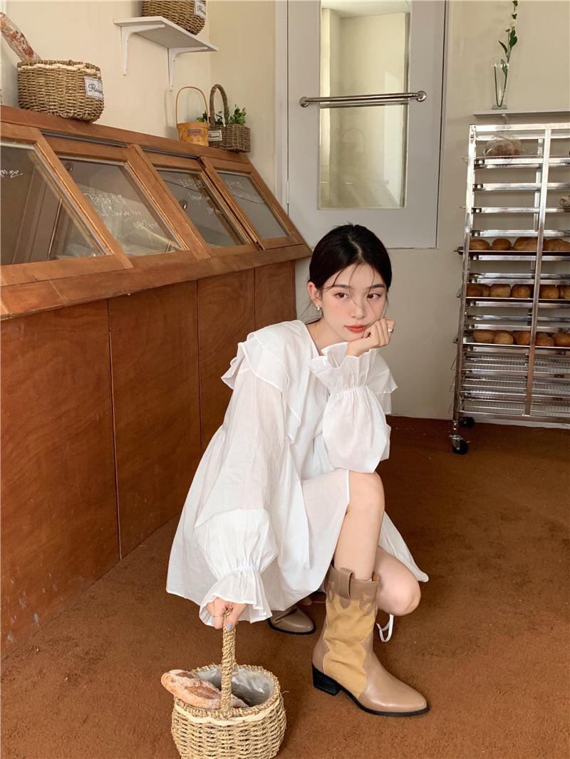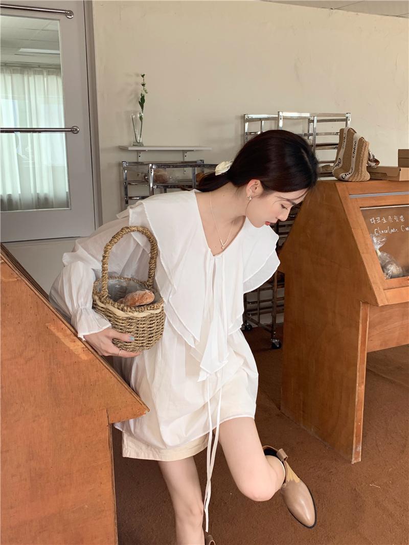 韓版氣質假兩件襯衫領針織拼接中長款連身裙