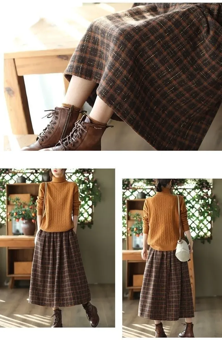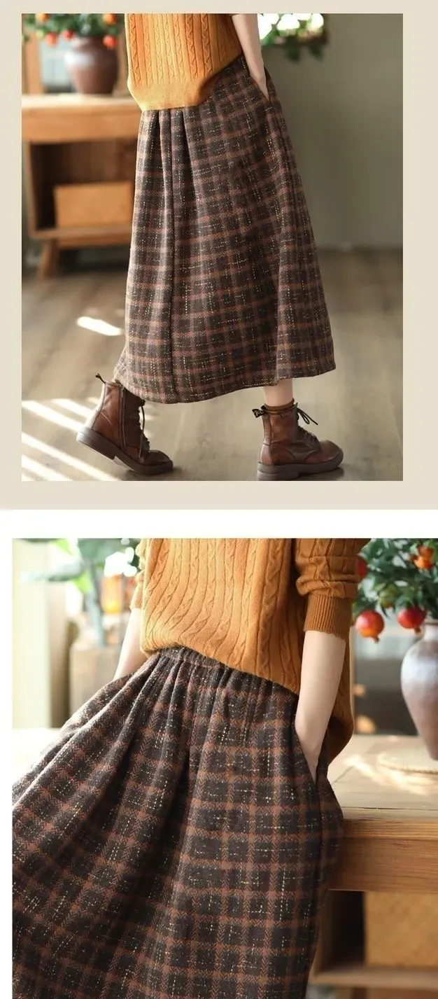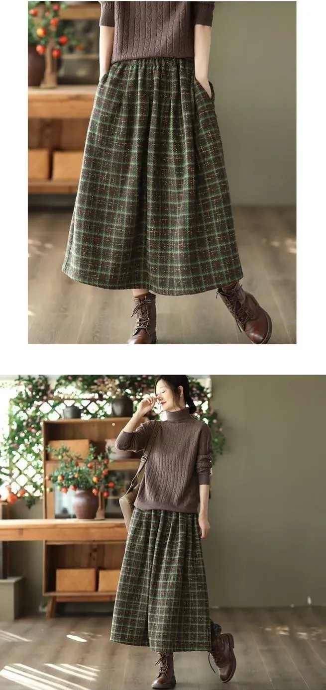 休閒寬鬆格子毛呢鬆緊腰a字半身裙