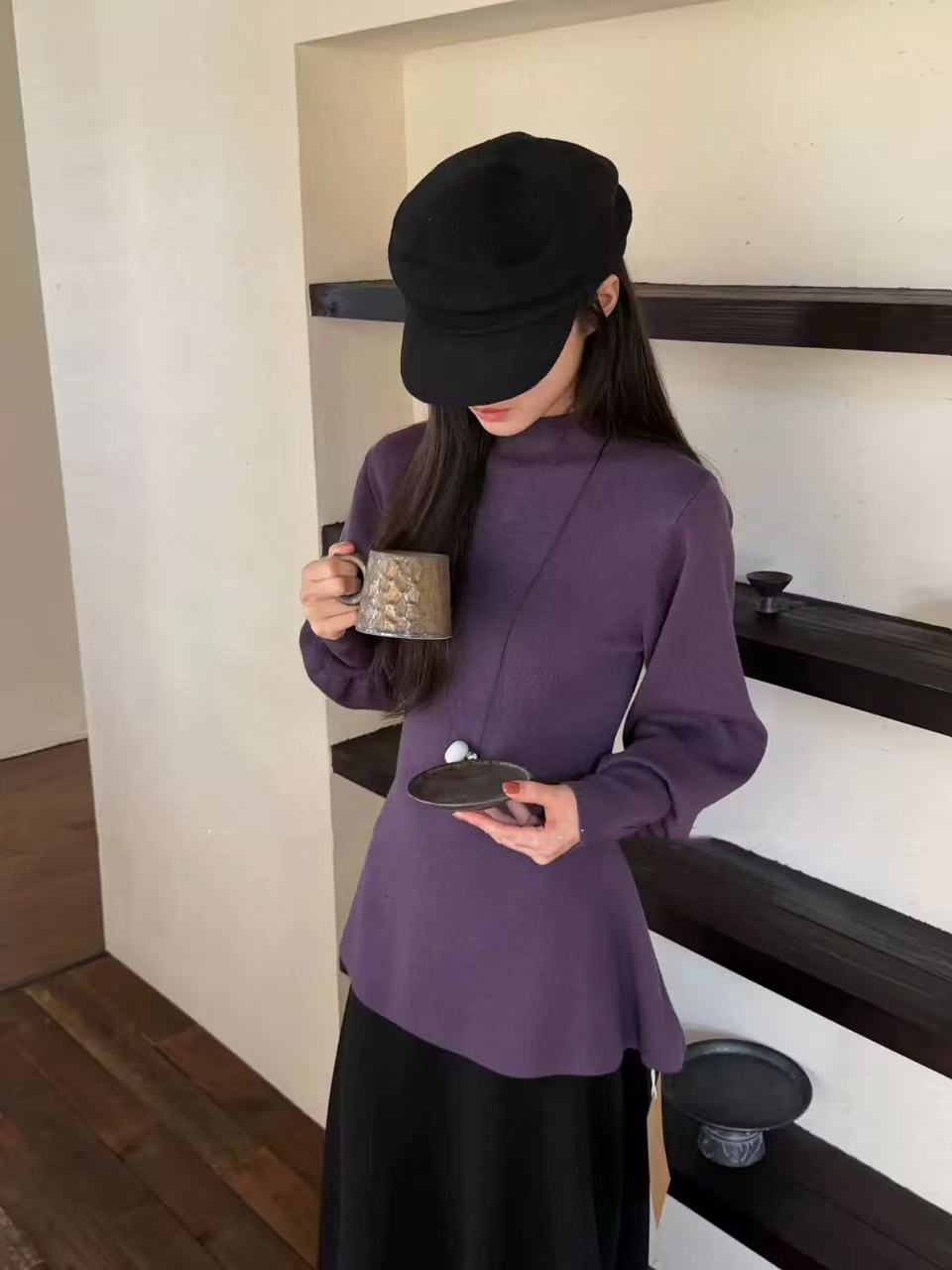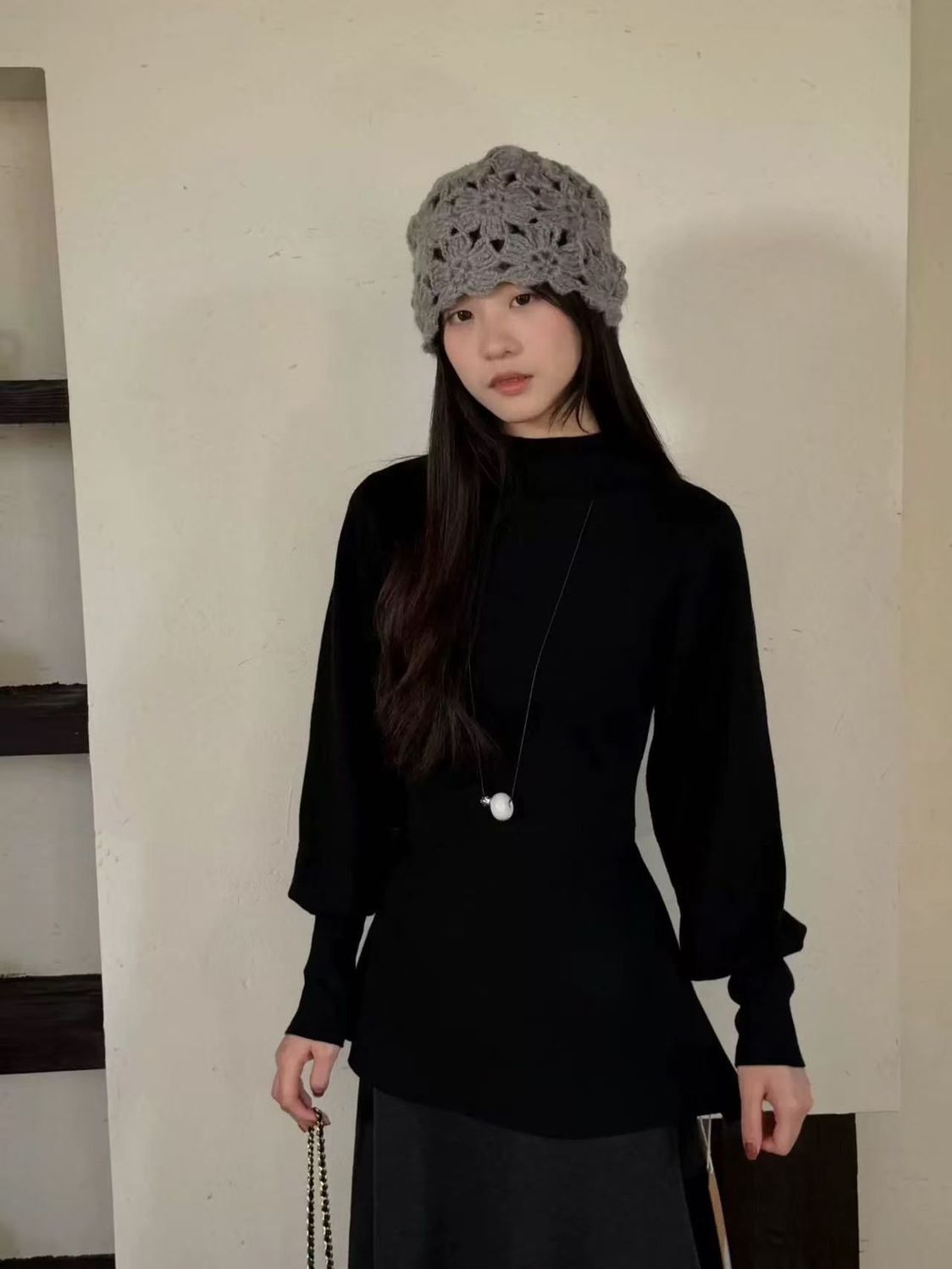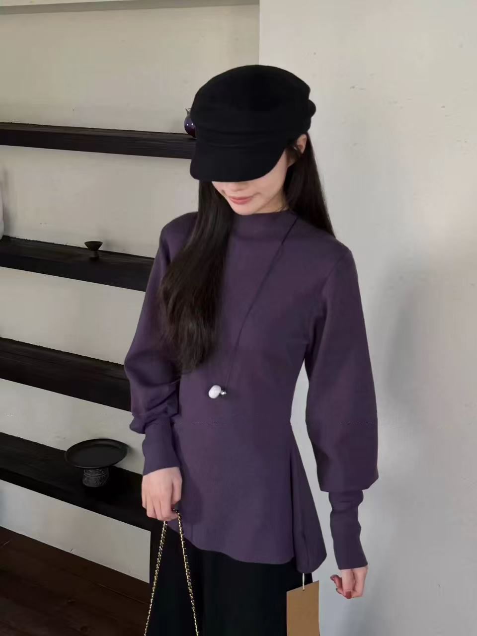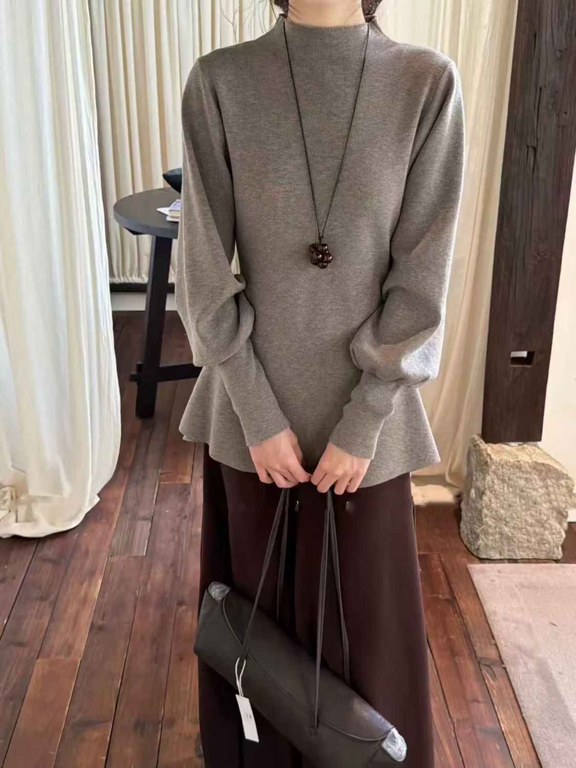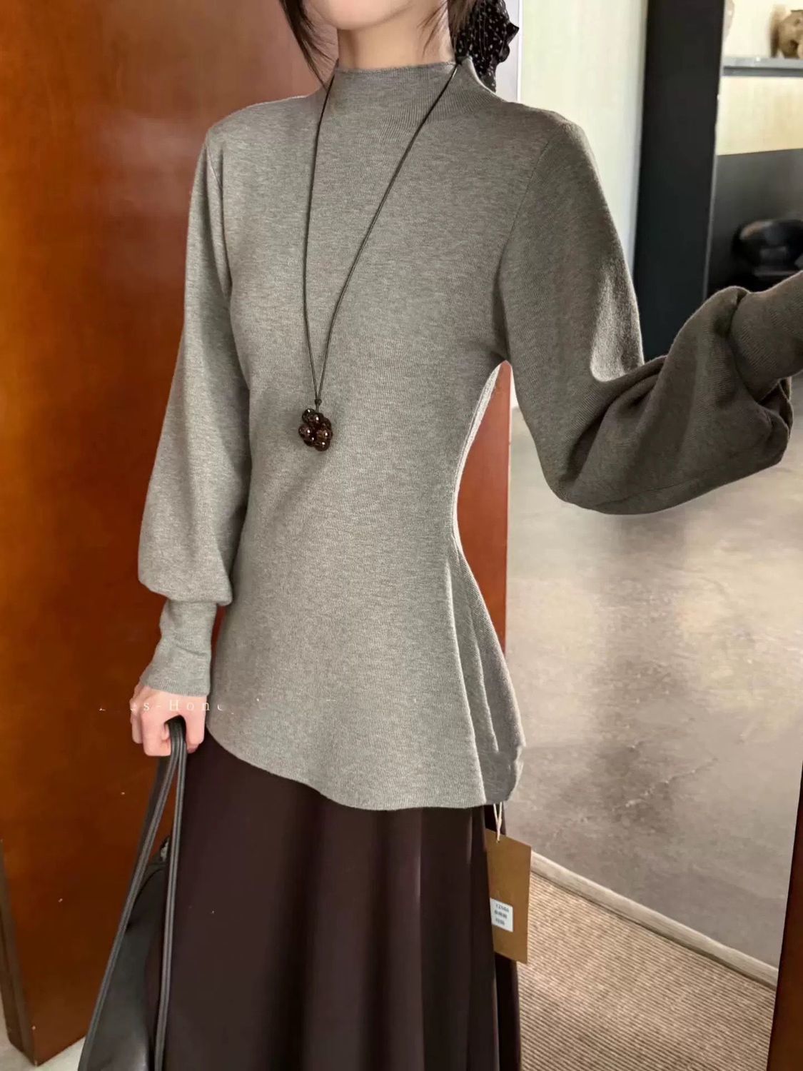 法式半高領燈籠袖收腰慵懶氣質針織衫