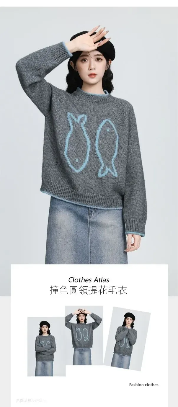 圓領套頭軟糯簡約通勤提花寬鬆針織衫